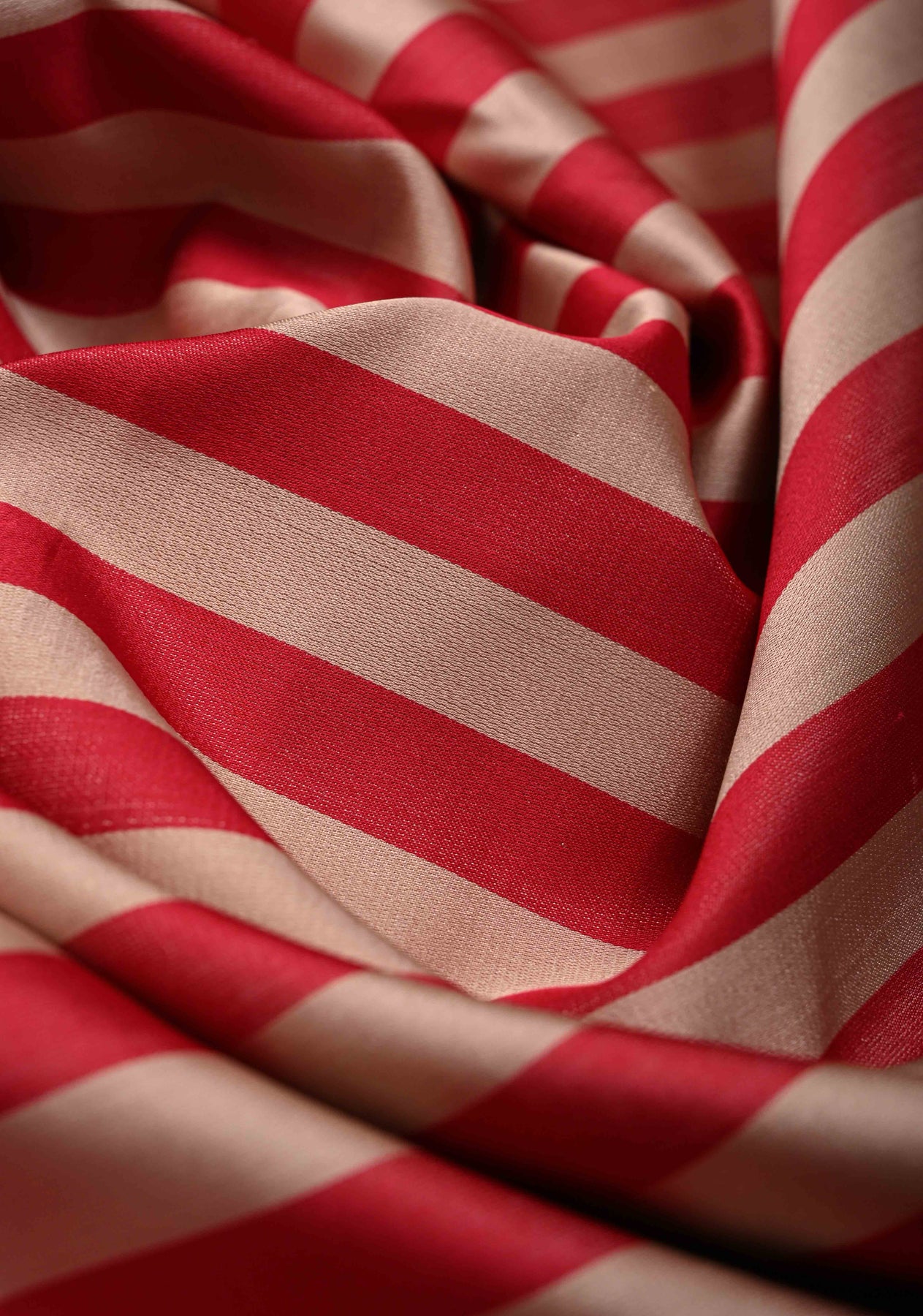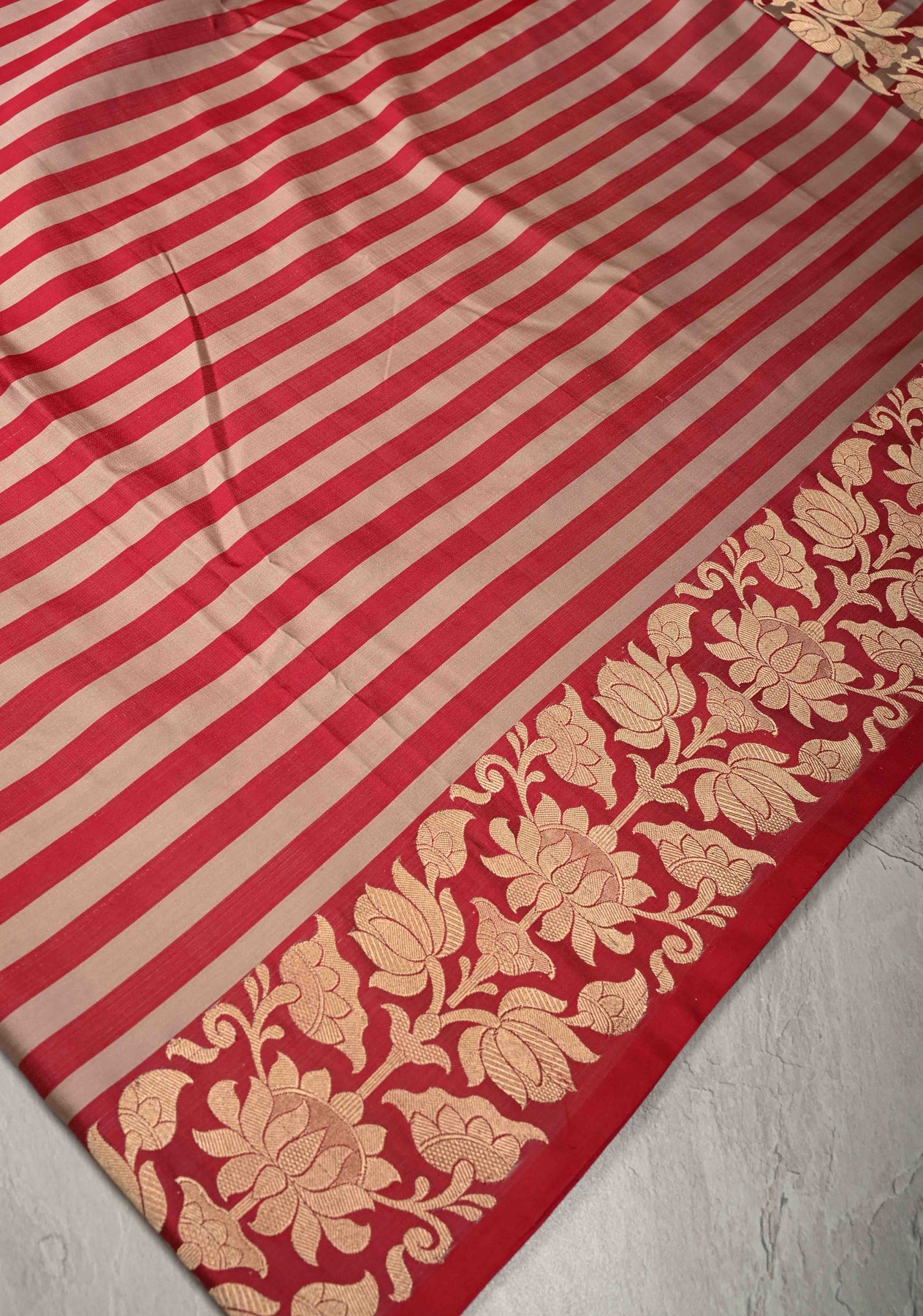 Sandstone-Brick Red Banarasi Mashru Silk Saree with Horizontal Stripes and Floral Zari Border | SILK MARK CERTIFIED