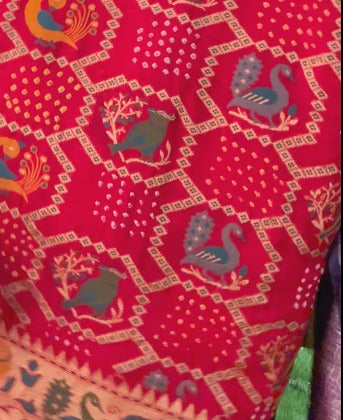 This magnificent saree is a fusion of some of India's richest weaving traditions. The blood red tone, a classic color for weddings and celebrations, is beautifully presented on a luxurious georgette silk fabric. The body features an authentic hand-Bandhej tie-dye pattern, which is intricately woven with a Banarasi Shikargah zari jaal. This rich jaal depicts traditional hunting scenes and nature motifs, adding a captivating narrative. The pallu and border are crafted in the opulent Paithani style, known for its vibrant and intricate weaving, creating a truly grand and unique statement piece.
