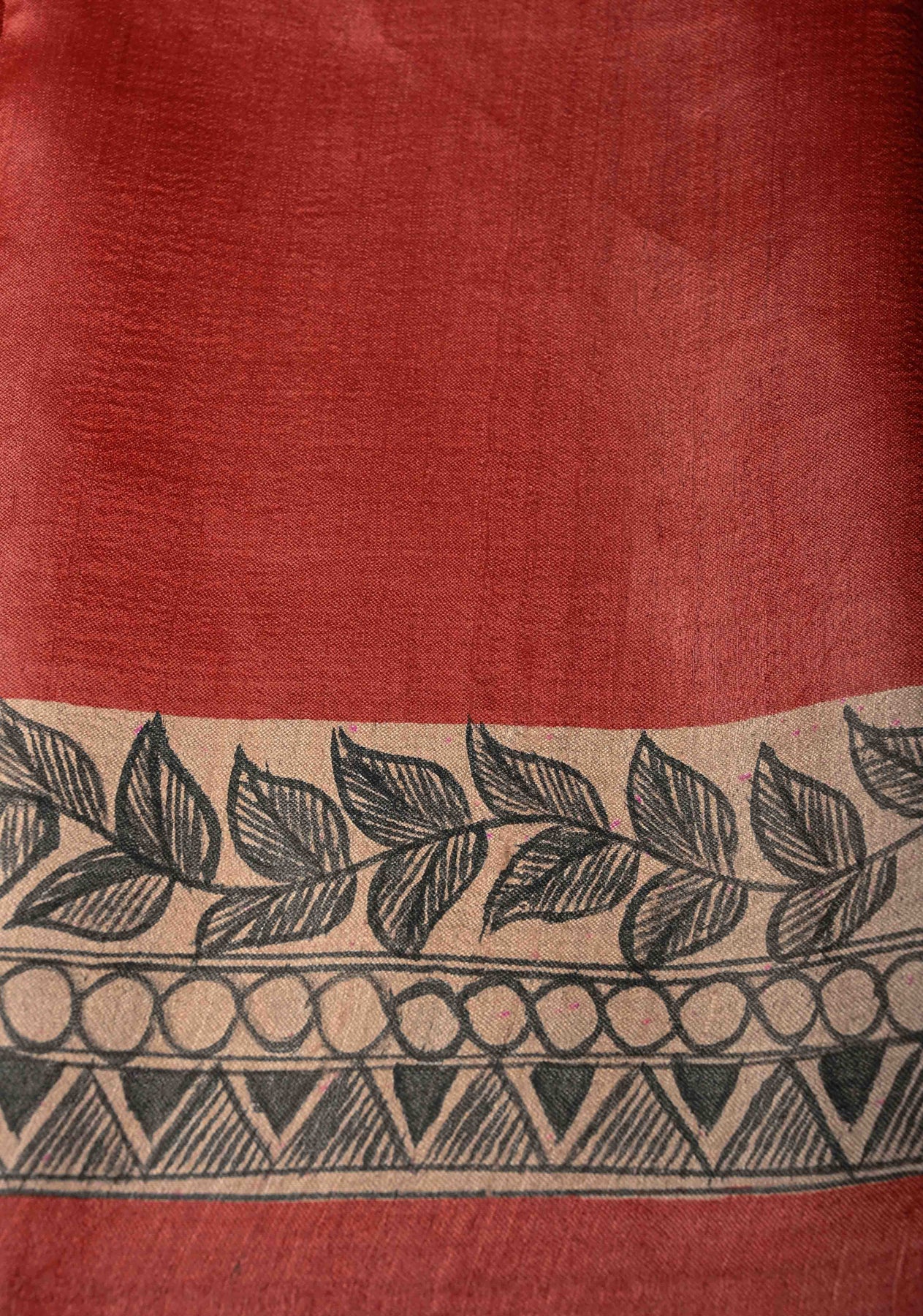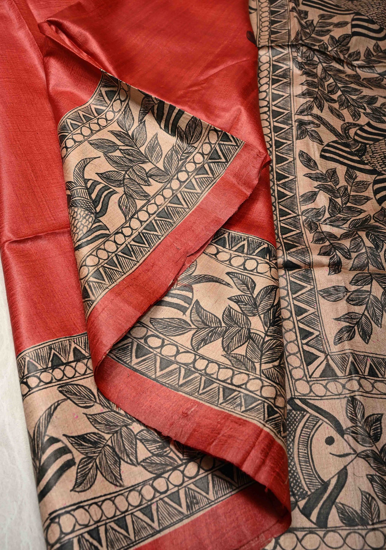 Brick Red Madhubani hand painting on Geecha Tussar Silk Saree | SILK MARK CERTIFIED