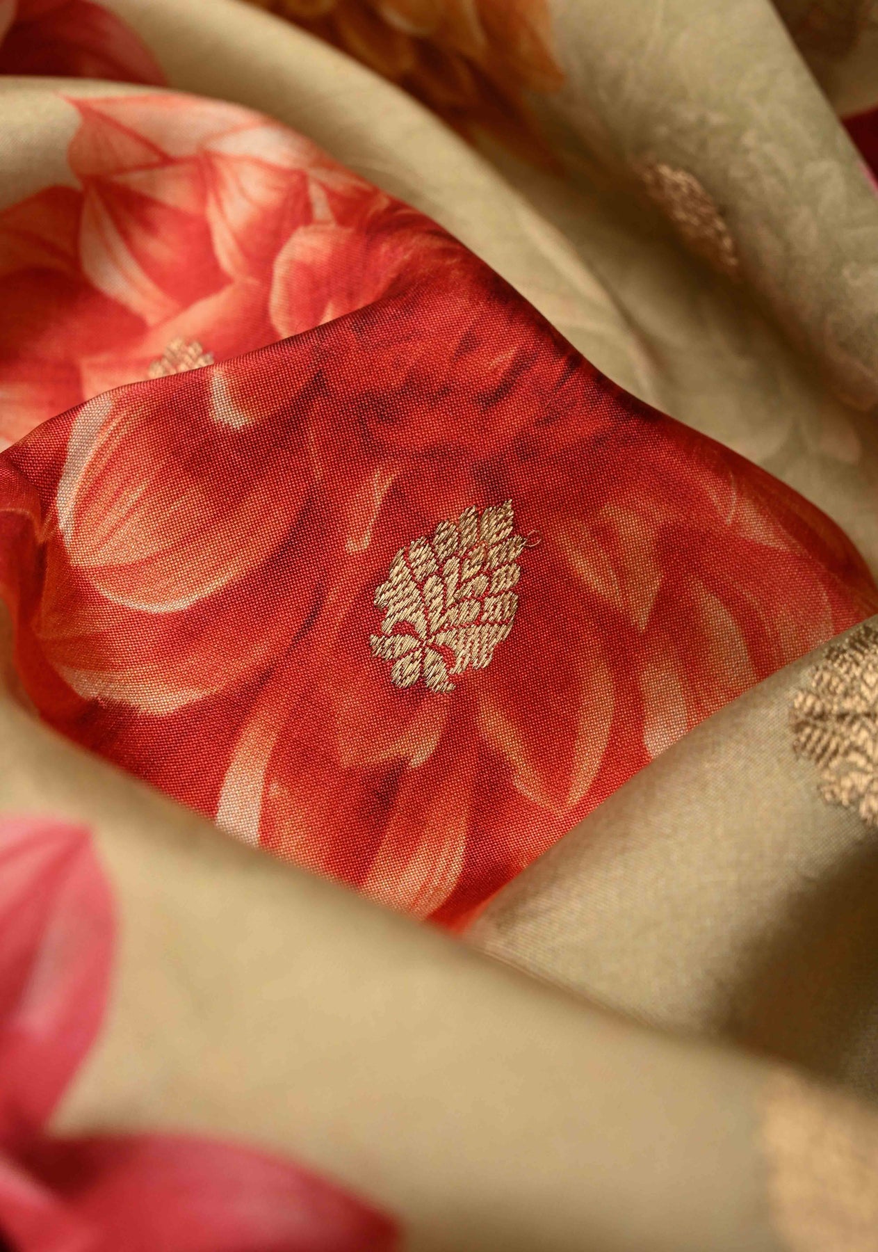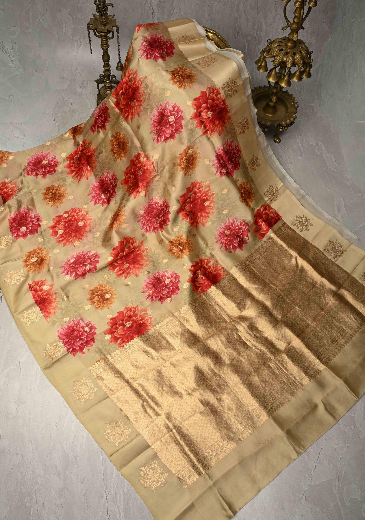 Cream Floral Digital Print on Banarasi Mashru Silk Saree with Zari Buttas and Zari Border | SILK MARK CERTIFIED