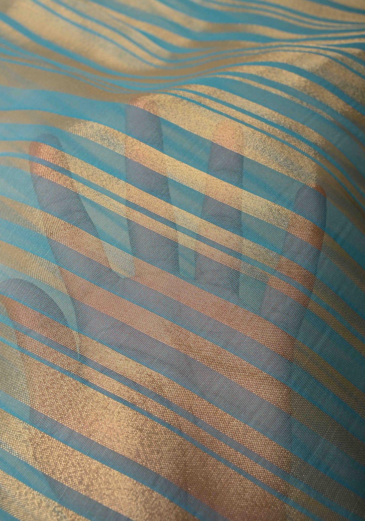 Delicate tissue stripes adorn the saree, adding a gentle shimmer that enhances the vibrant cyan base with understated texture and grace. These subtle metallic lines create a refined play of light, perfect for both day and evening occasions.