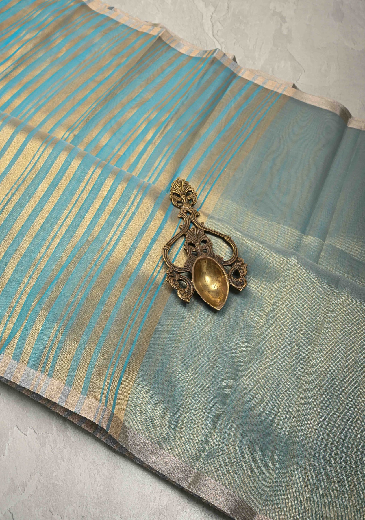 Cyan Semi Kora Saree with Tissue Stripes and Minimal Zari Border
