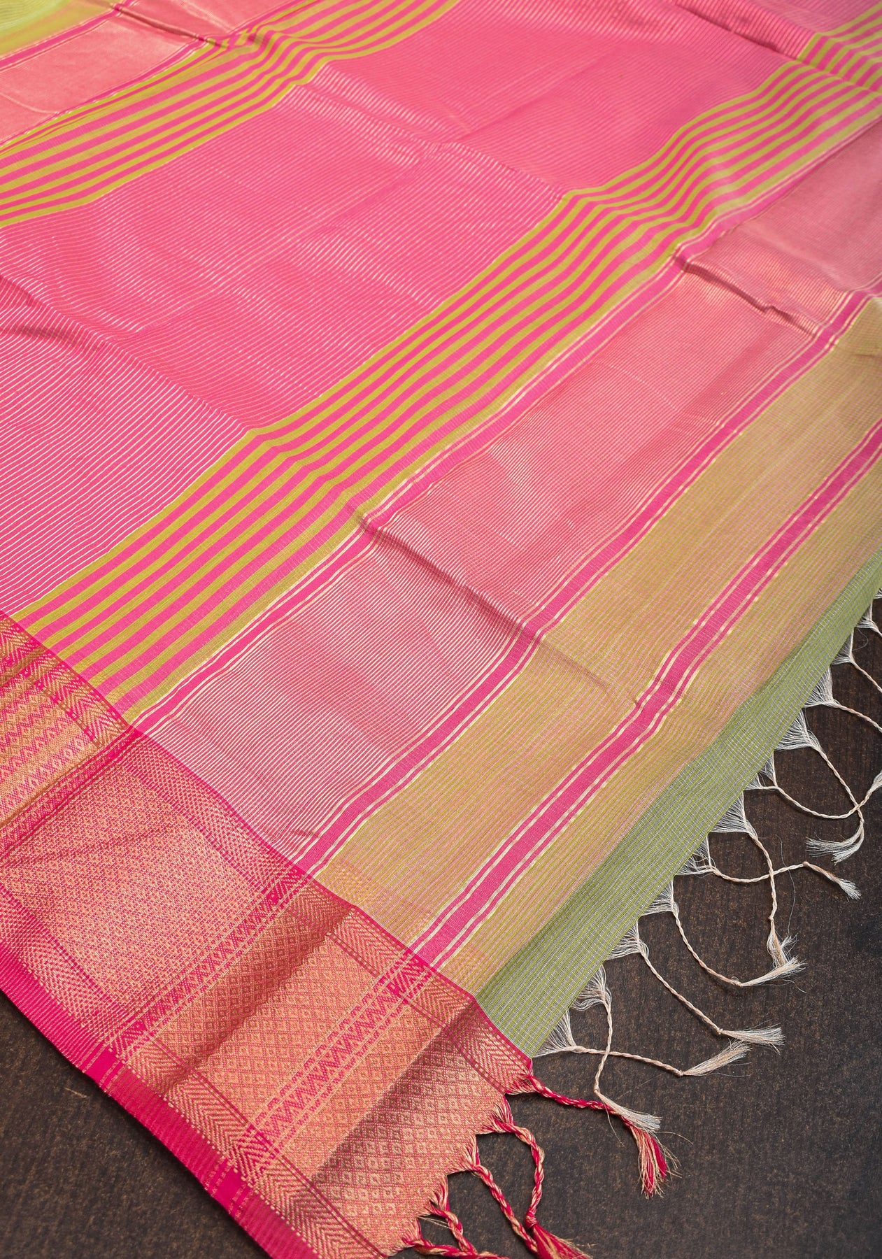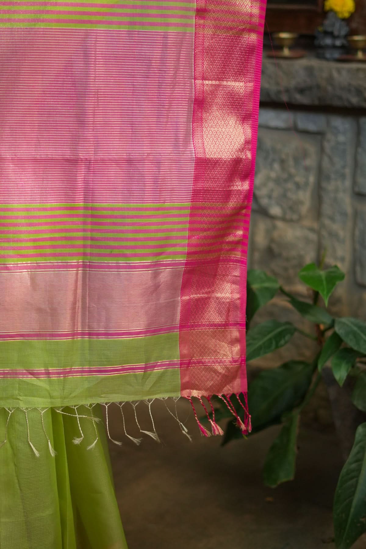 Handwoven Maheshwari silk cotton saree in Pista Green with Zari Checks