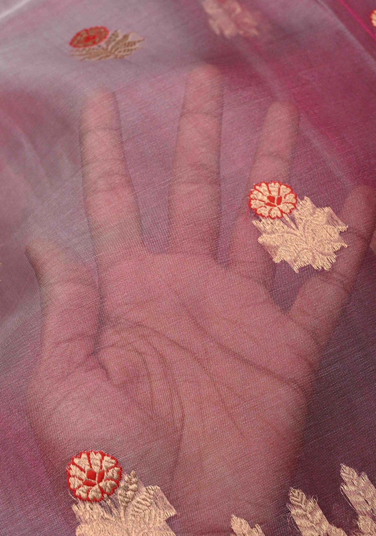Delicate yet regal, this Onion Pink Pure Banarasi Organza Silk Saree is a masterpiece of traditional craftsmanship and subtle elegance. Woven from organza silk, it features a graceful dual-tone pink hue that shifts beautifully in the light, adding depth and sophistication. The saree is adorned with intricately crafted Meenakari buttas that showcase fine detailing and vibrant accents, reflecting the rich heritage of Banarasi weaving. A zari border completes the look, enhancing its traditional charm. Lightweight and graceful, this saree is perfect for weddings, festive occasions, and special celebrations.
