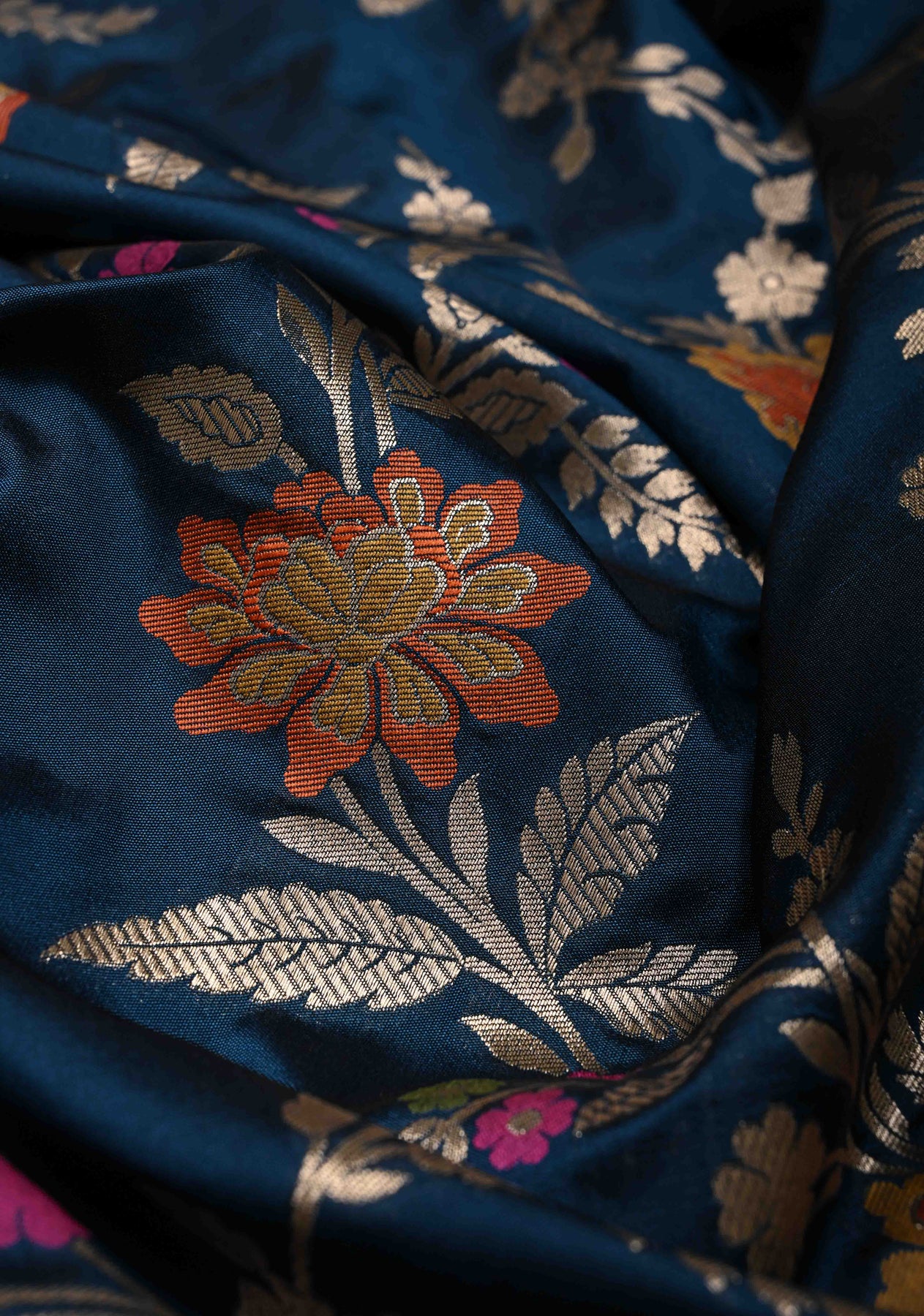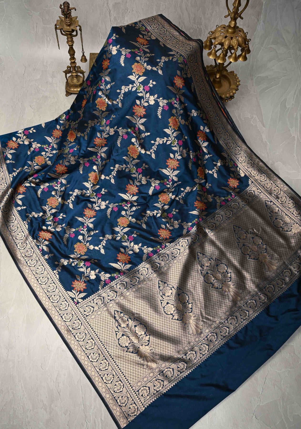 Graceful and timeless, this Prussian blue semi-silk saree is a stunning display of refined tradition. Adorned with an intricate floral Meenakari jaal, the saree showcases delicate, multicolored motifs that add depth and vibrancy to the rich blue base. The semi-silk fabric offers a soft sheen and fluid drape, while the shimmering zari border lends a regal finish. Perfect for festive events, weddings, or cultural celebrations, this saree beautifully combines classic craftsmanship with elegant color tones for a truly sophisticated look.