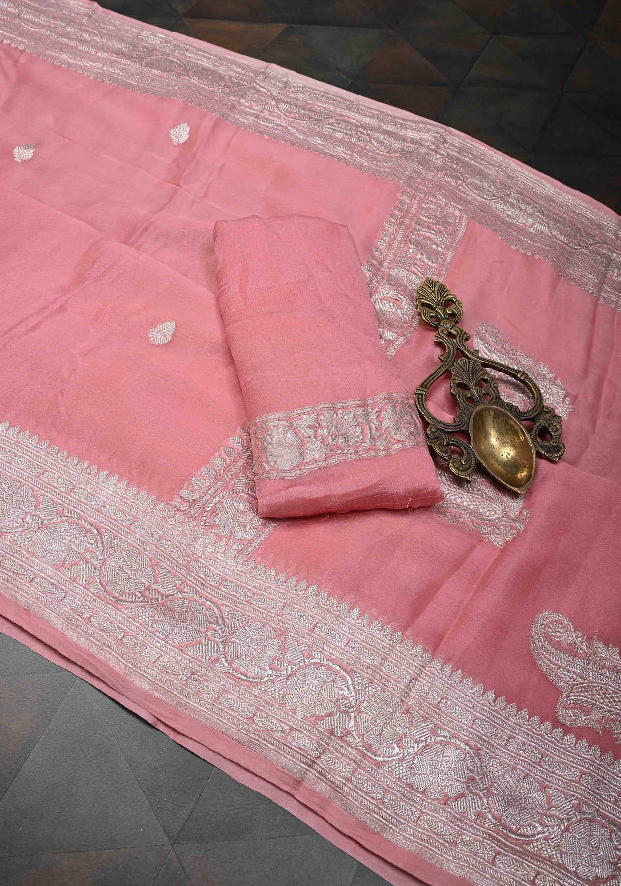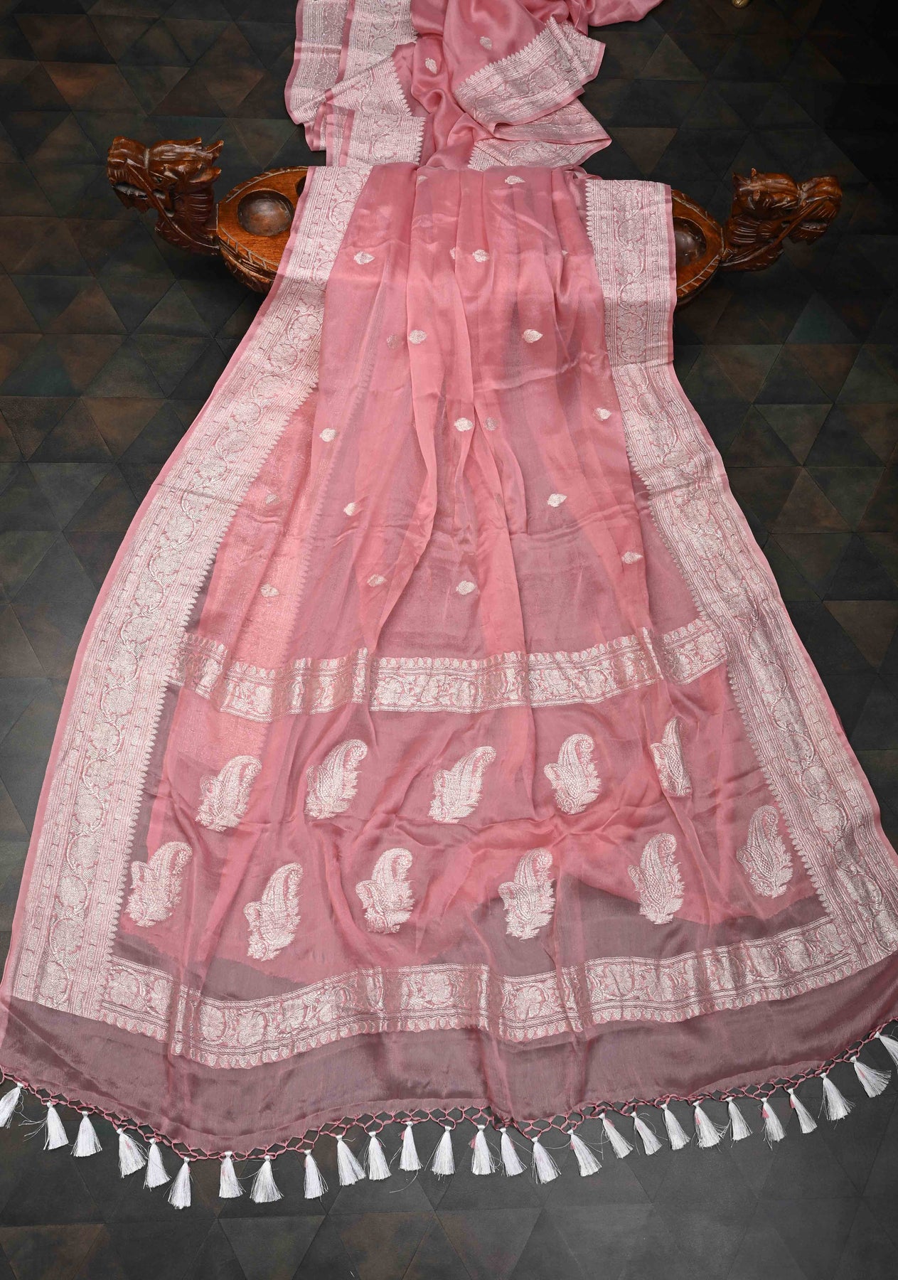 Soft, elegant, and timeless, the Dusty Rose Pure Chiffon Silk Saree is a perfect blend of tradition and subtle sophistication. Crafted from lightweight chiffon silk, it drapes offering a graceful and flattering silhouette. The saree is adorned with delicate silver tone zari buttas scattered across the body, while a finely woven silver tone zari border adds a refined touch of shimmer. The gentle dusty rose hue enhances its romantic charm, making it ideal for festive occasions, intimate celebrations, or elegant evening wear.