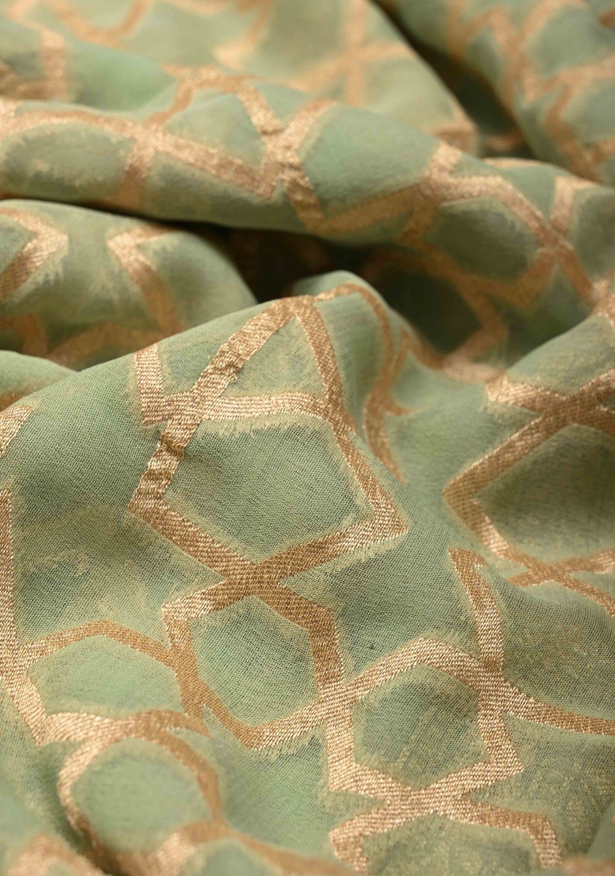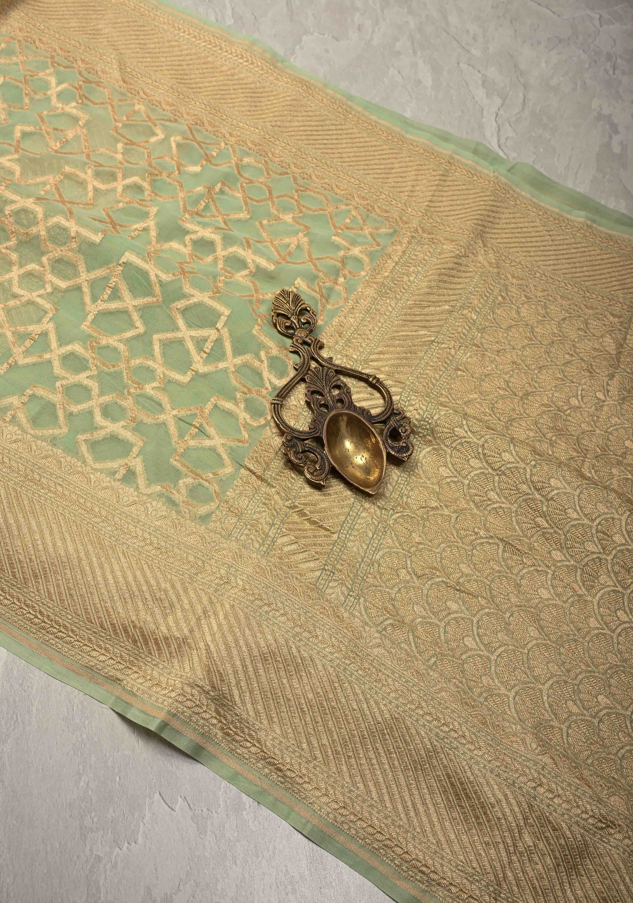 Sage Green Banarasi Georgette Silk Saree with Morroccon Brocade Jaal and Zari Border | SILK MARK CERTIFIED
