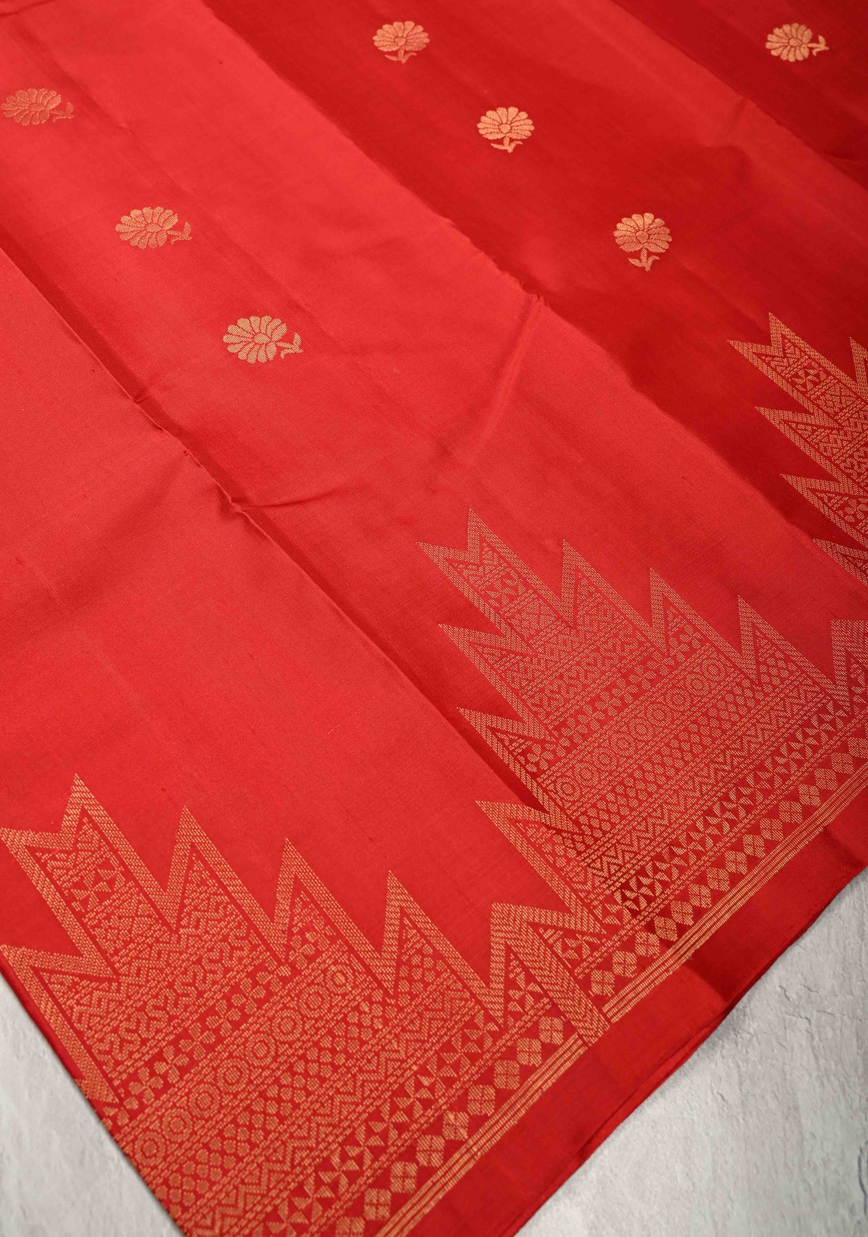Scarlet Red Kanjivaram Soft Silk Saree with Floral Buttas and Temple Zari Border | SILK MARK CERTIFIED