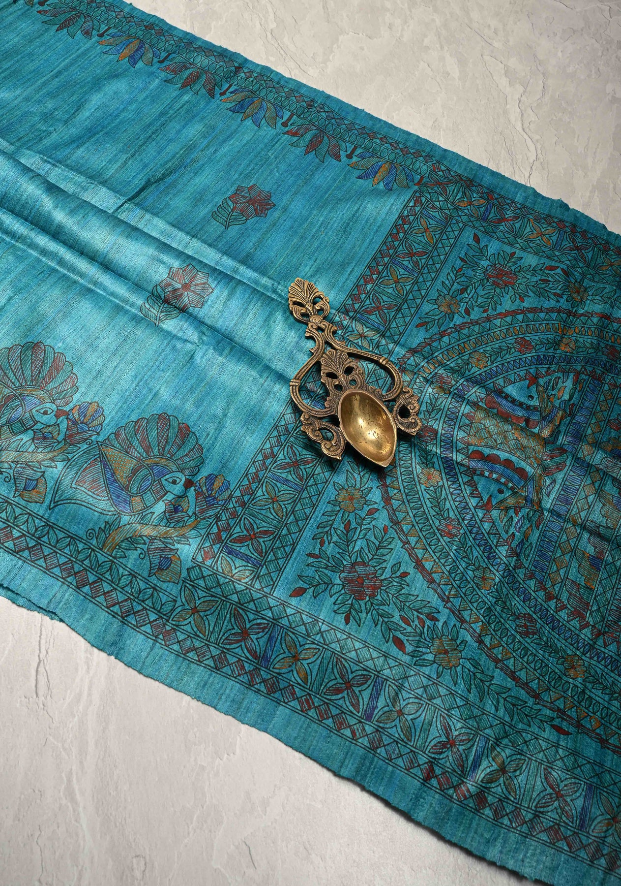 Teal Blue Madhubani hand painting on Geecha Tussar Silk Saree | SILK MARK CERTIFIED
