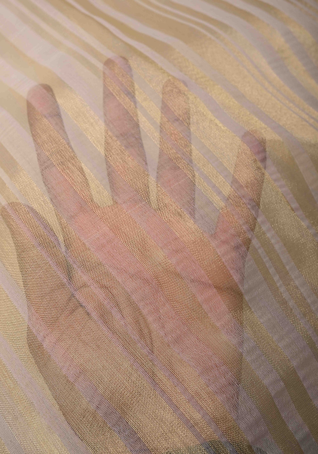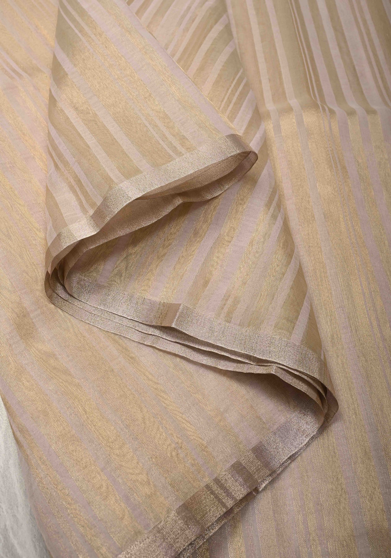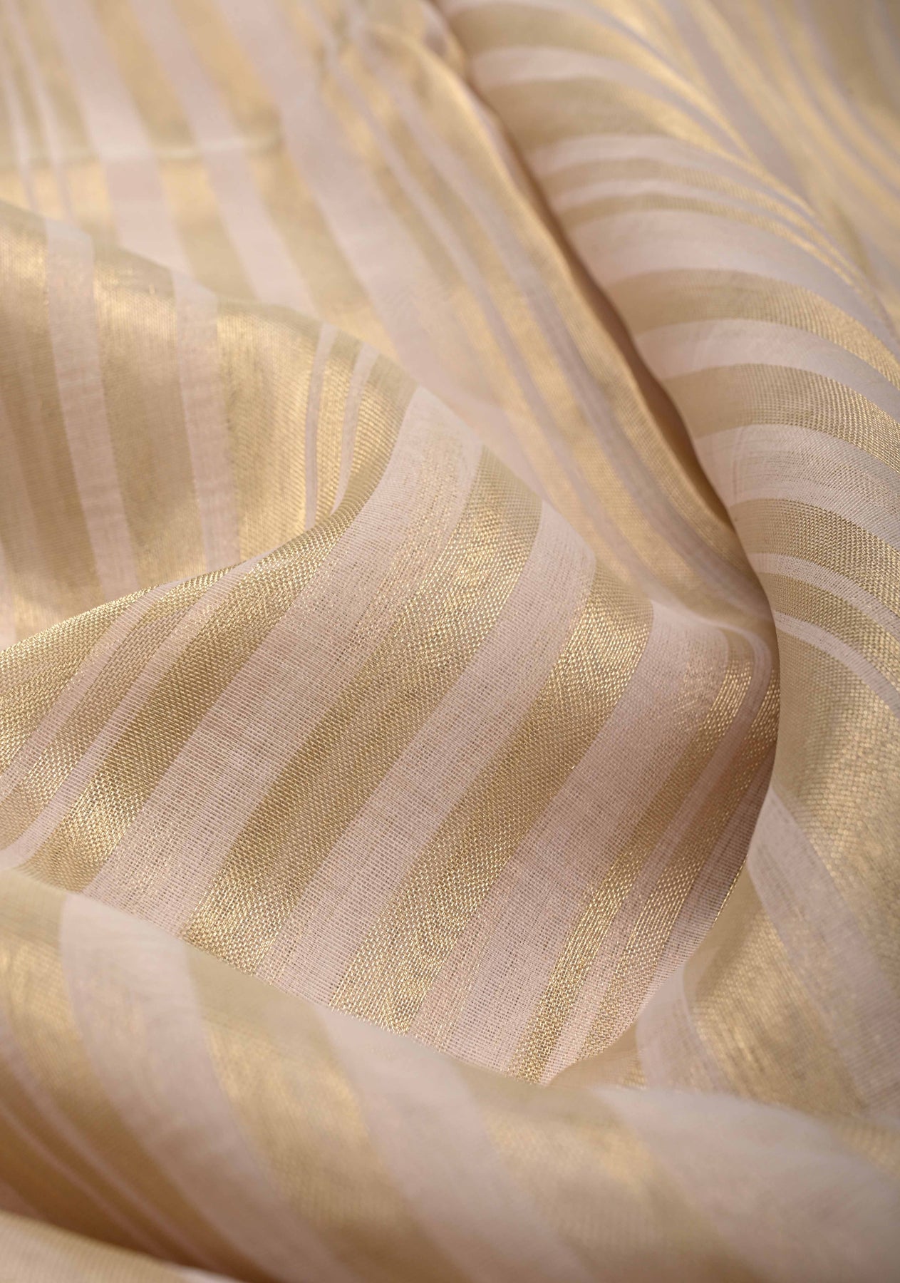 The saree features delicate tissue stripes that lend a gentle sheen to the pristine white base, creating a subtle play of texture and light. These understated metallic lines add a modern touch while preserving the saree’s serene and classic appeal.