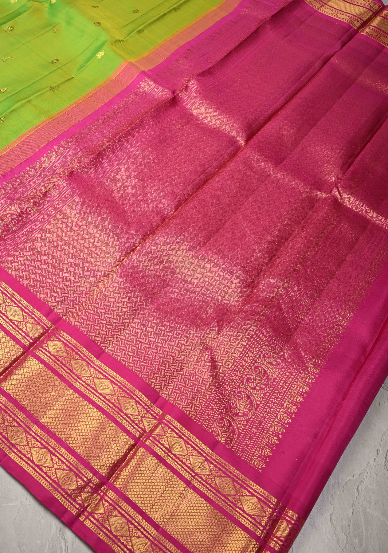 This stunning Chartreuse Korvai Weave Kanjivaram Pure Silk Saree is a radiant blend of vibrant color and masterful craftsmanship. Woven from premium pure silk, the saree features a bright chartreuse body adorned with elegant zari buttas that shimmer subtly across the fabric. The distinctive Korvai weave technique adds richness and texture, while the contrasting zari border beautifully frames the saree with intricate traditional patterns. Perfect for weddings, festive occasions, and special events, this saree is a timeless piece that celebrates heritage with a modern touch.