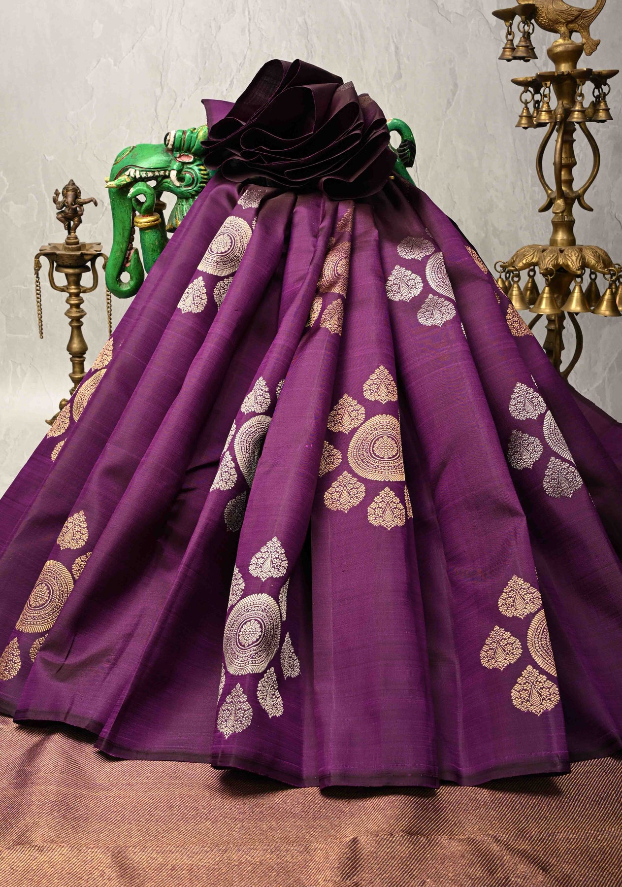This exquisite Eggplant Purple Borderless Pure Kanjivaram Silk Saree is a masterpiece of understated elegance. Crafted from pure silk, the saree showcases a Eggplant purple shade throughout, enhanced by intricate gold and silver motifs delicately woven across the fabric. The absence of a traditional border emphasizes the saree’s seamless beauty and lets the shimmering motifs take center stage. Perfect for sophisticated occasions and cultural celebrations, this saree reflects timeless heritage with a minimalist yet regal appeal.