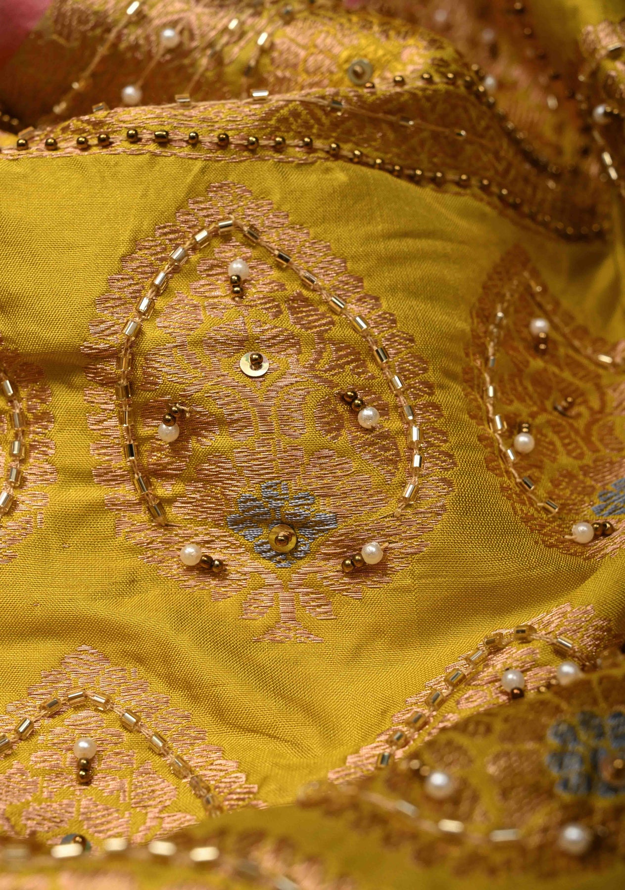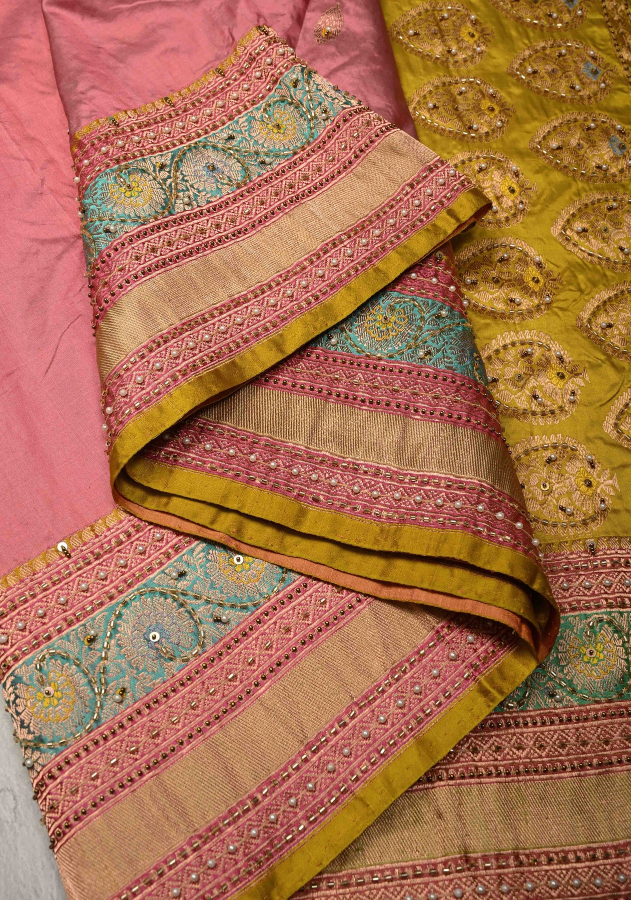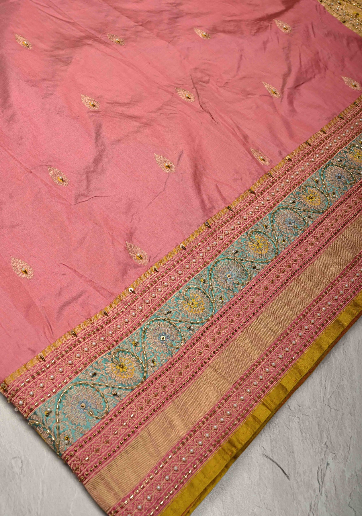 This Rose Pink Katan Silk Saree is a breathtaking fusion of heritage weaving and opulent embellishment. Crafted from Katan silk, it features intricate meenakari work that brings vibrant detail and color to the traditional design. The body is adorned with shimmering zari buttas, while delicate sequins, cutdana, and moti (pearl) handwork add layers of sparkle and texture, creating a festive look. The rose pink hue enhances its feminine charm, making it an exquisite choice for weddings, receptions, or grand celebrations where elegance meets artisanal grandeur.