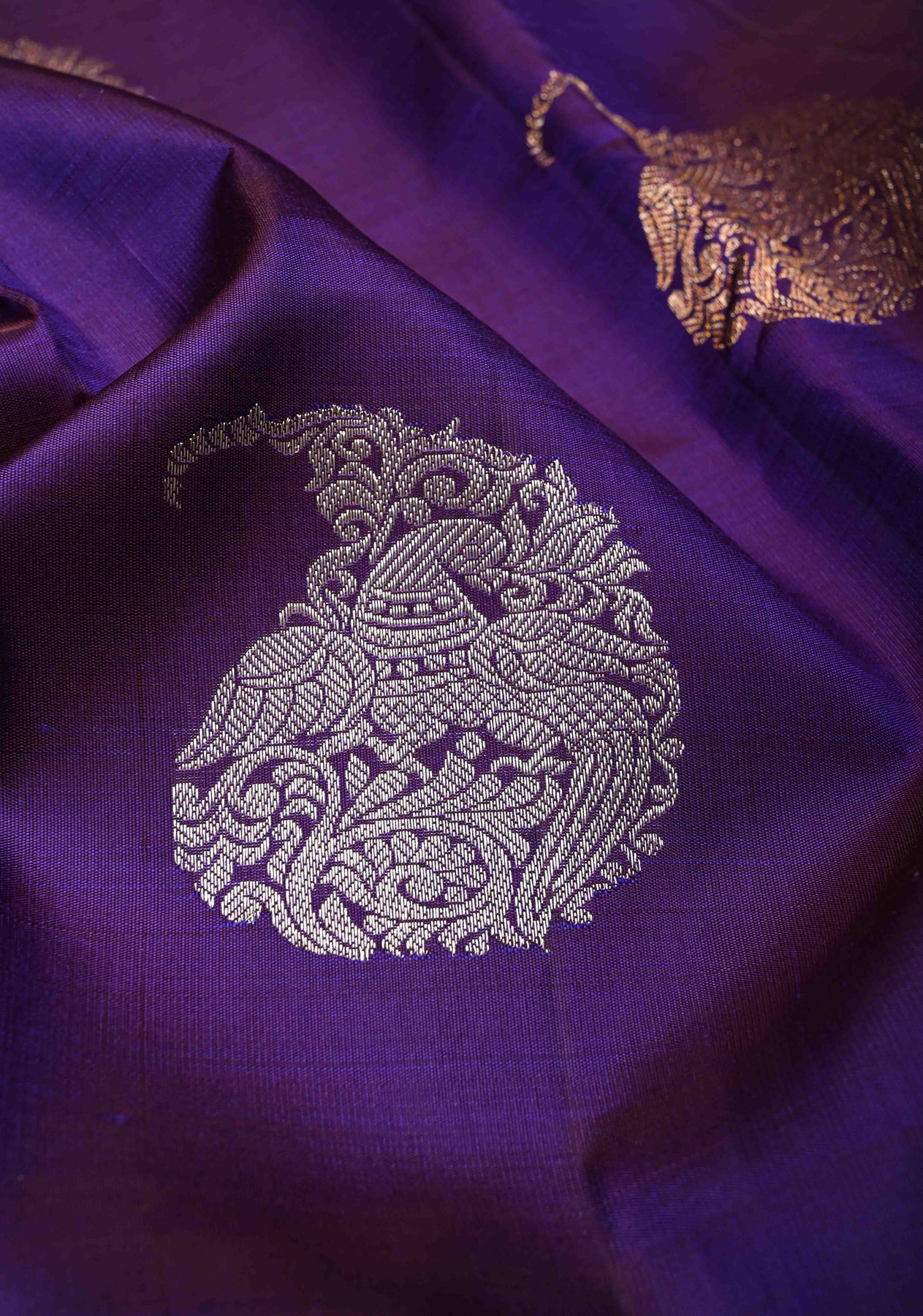 Embrace understated elegance with this Ink Purple Borderless Pure Kanjivaram Silk Saree, a masterpiece that beautifully combines tradition and modernity. The rich ink purple shade exudes depth and sophistication, while the absence of a border offers a sleek, contemporary look. Adorned with delicate gold and silver paisley zari motifs intricately woven throughout the fabric, this saree radiates subtle opulence and timeless charm. Crafted from pure Kanjivaram silk, it promises luxurious texture and lasting quality, making it an ideal choice for festive celebrations, weddings, or special occasions where you want to make a graceful yet striking impression..