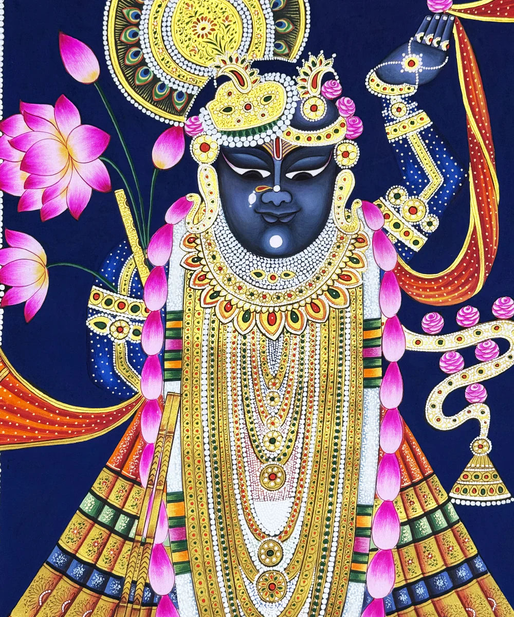 Buy Shrinath Ji Pichwai Hand Painting on Cloth – 36x24 inches, unframed. Traditional Indian wall art perfect for pooja rooms, temples, or spiritual home decor."
