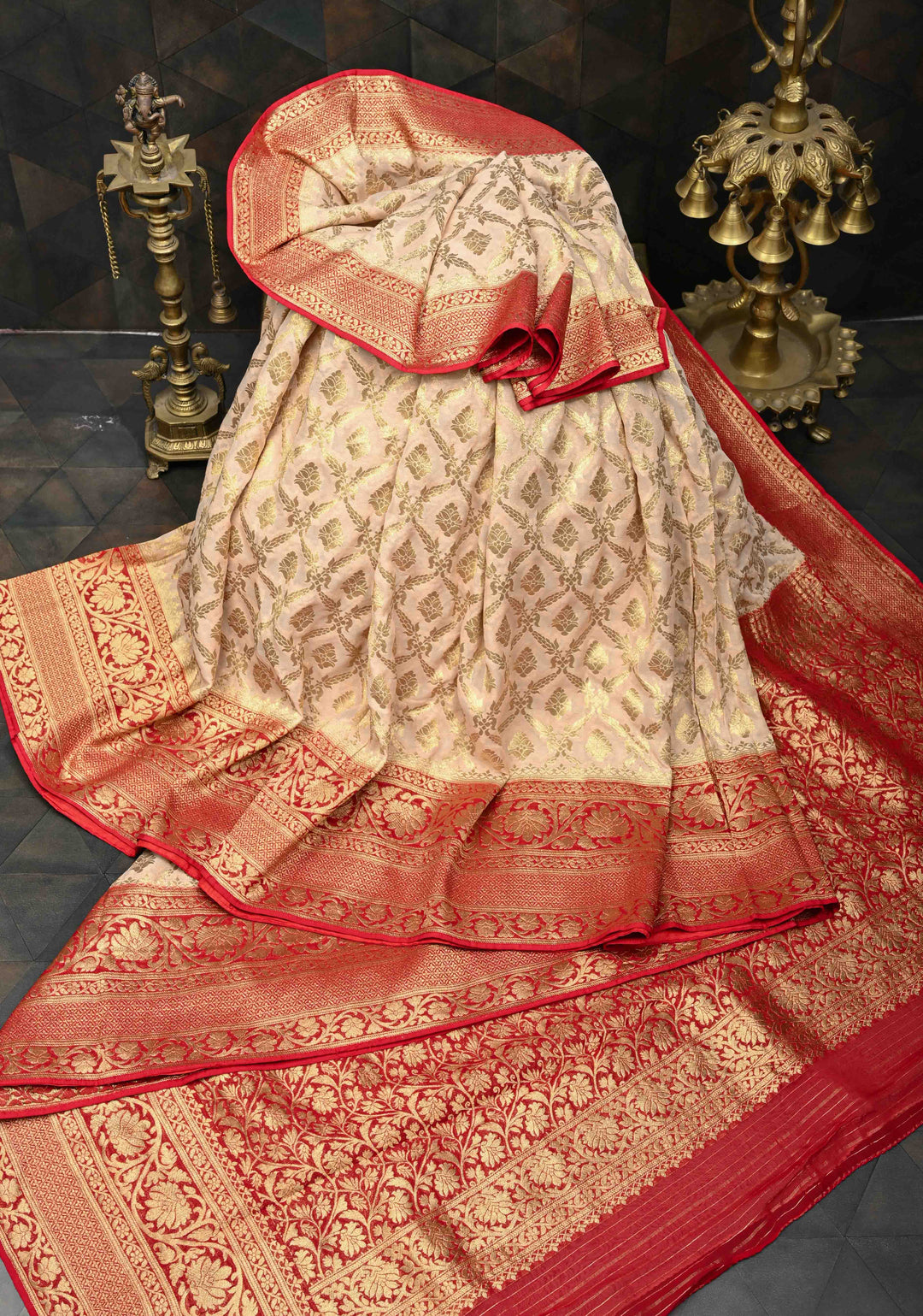 Beige Georgette Silk Banarasi Floral Jaal Saree with Contrast Red Zari Border