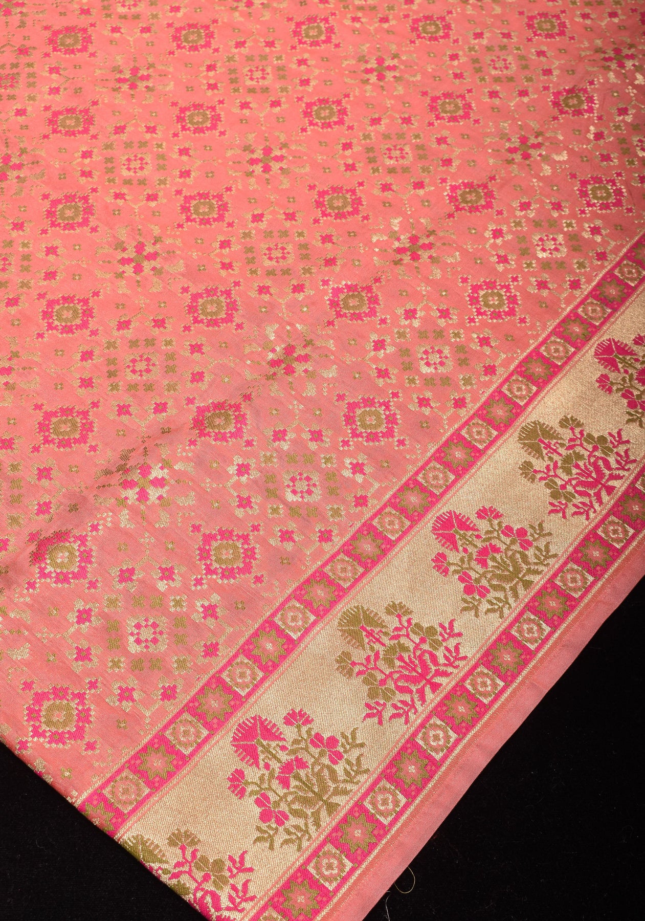 This Coral Pink semi Silk saree is decorated with an elegant Floral jaal design and Patola Pattern meenakari in zari all over, giving it a rich and luxurious look. The florals are accented with Meenakari resham Border and pallu. When these stunning elements combine, it's a match made in heaven!