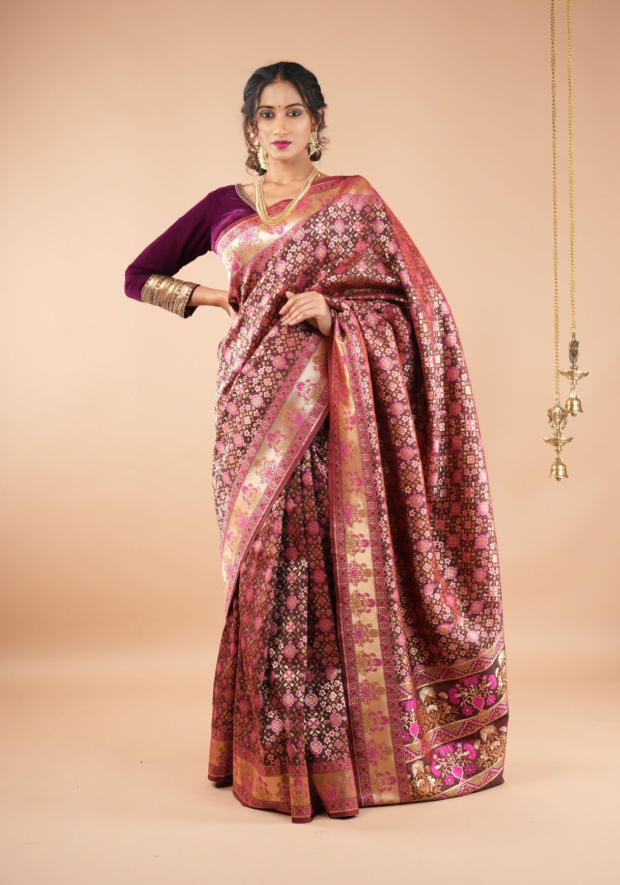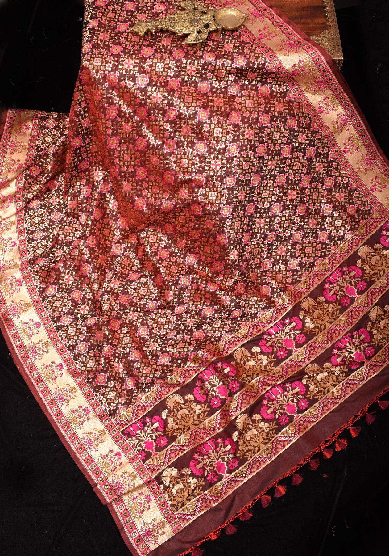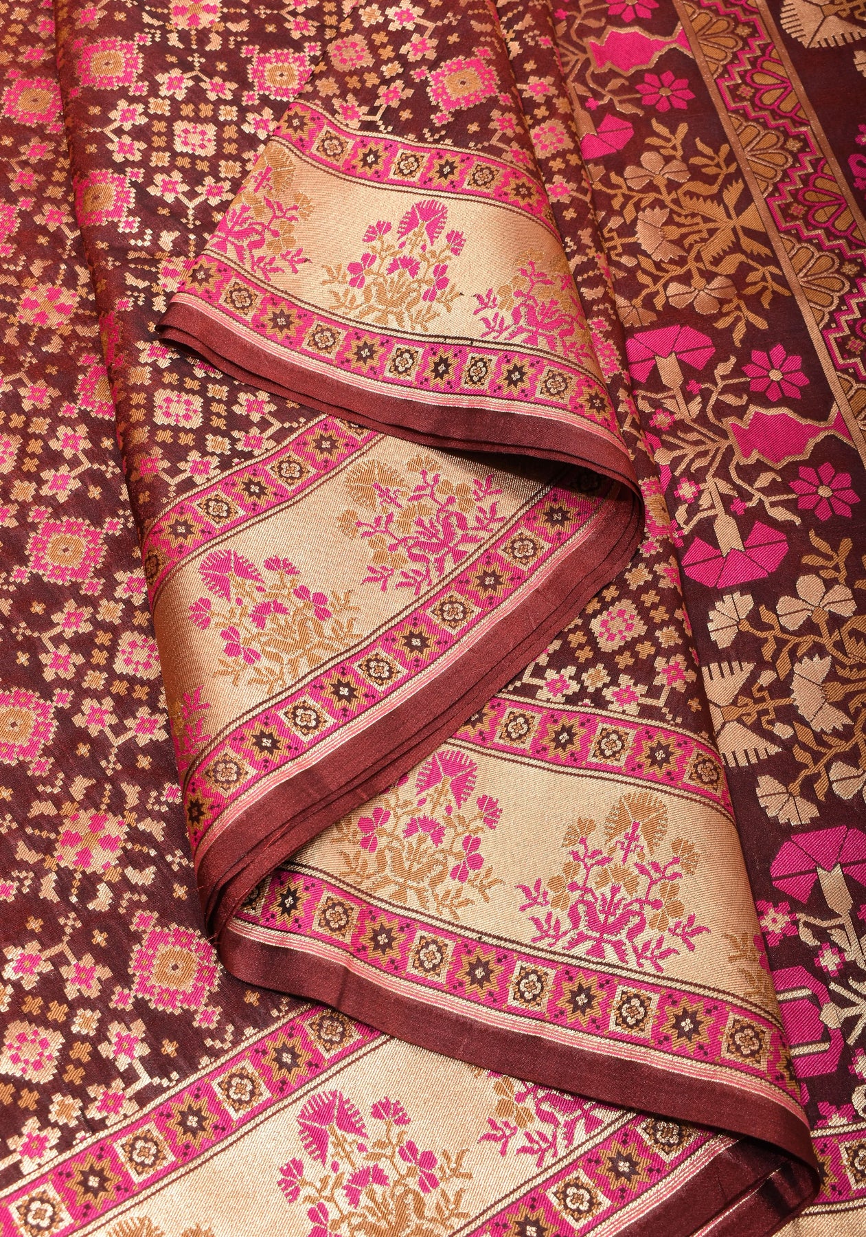 This Brown Semi Silk saree is decorated with an elegant Floral jaal design and Patola Ikkat Pattern meenakari in zari all over, giving it a rich and luxurious look. The florals are accented with Meenakari resham Border and pallu. When these stunning elements combine, it's a match made in heaven!