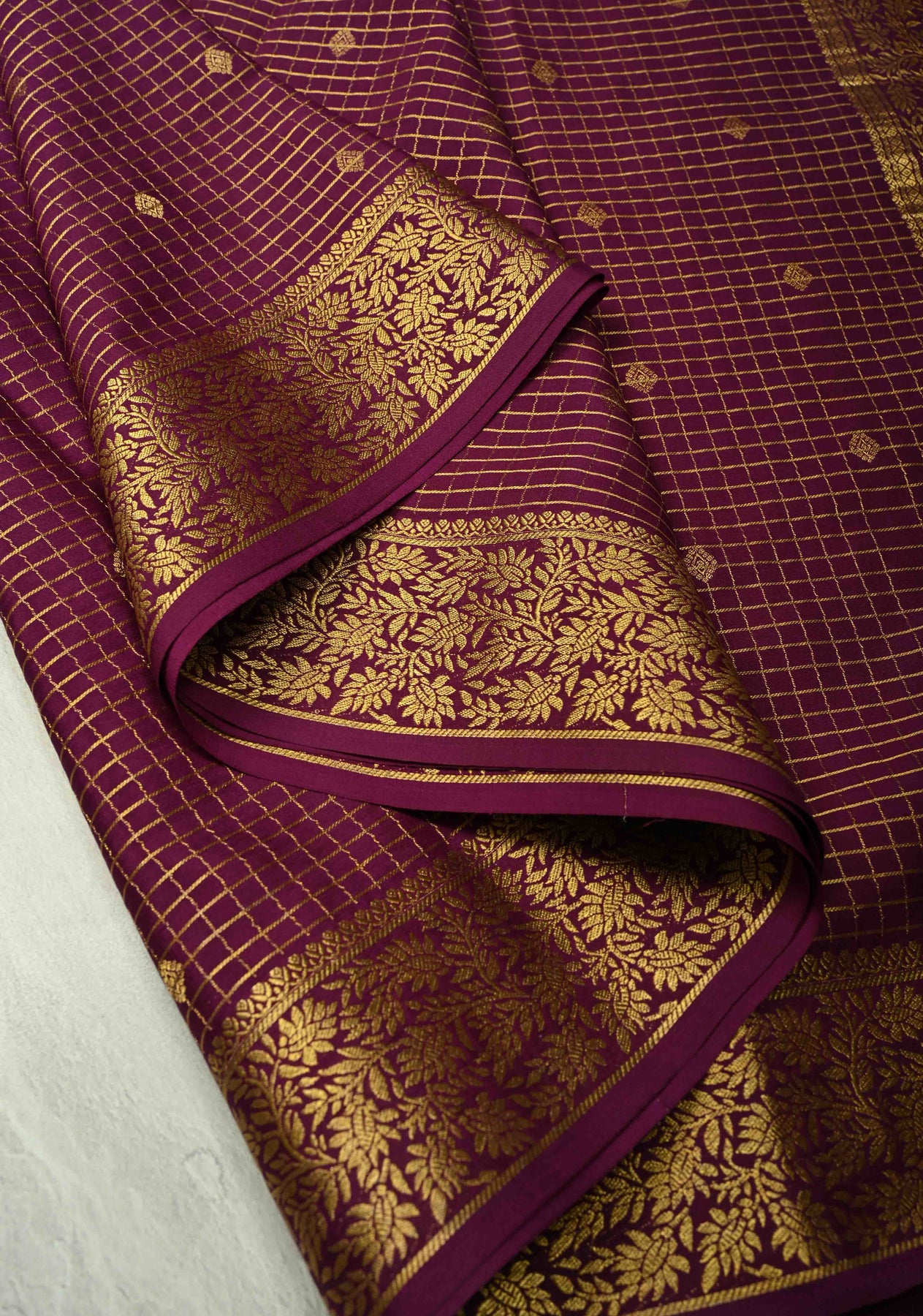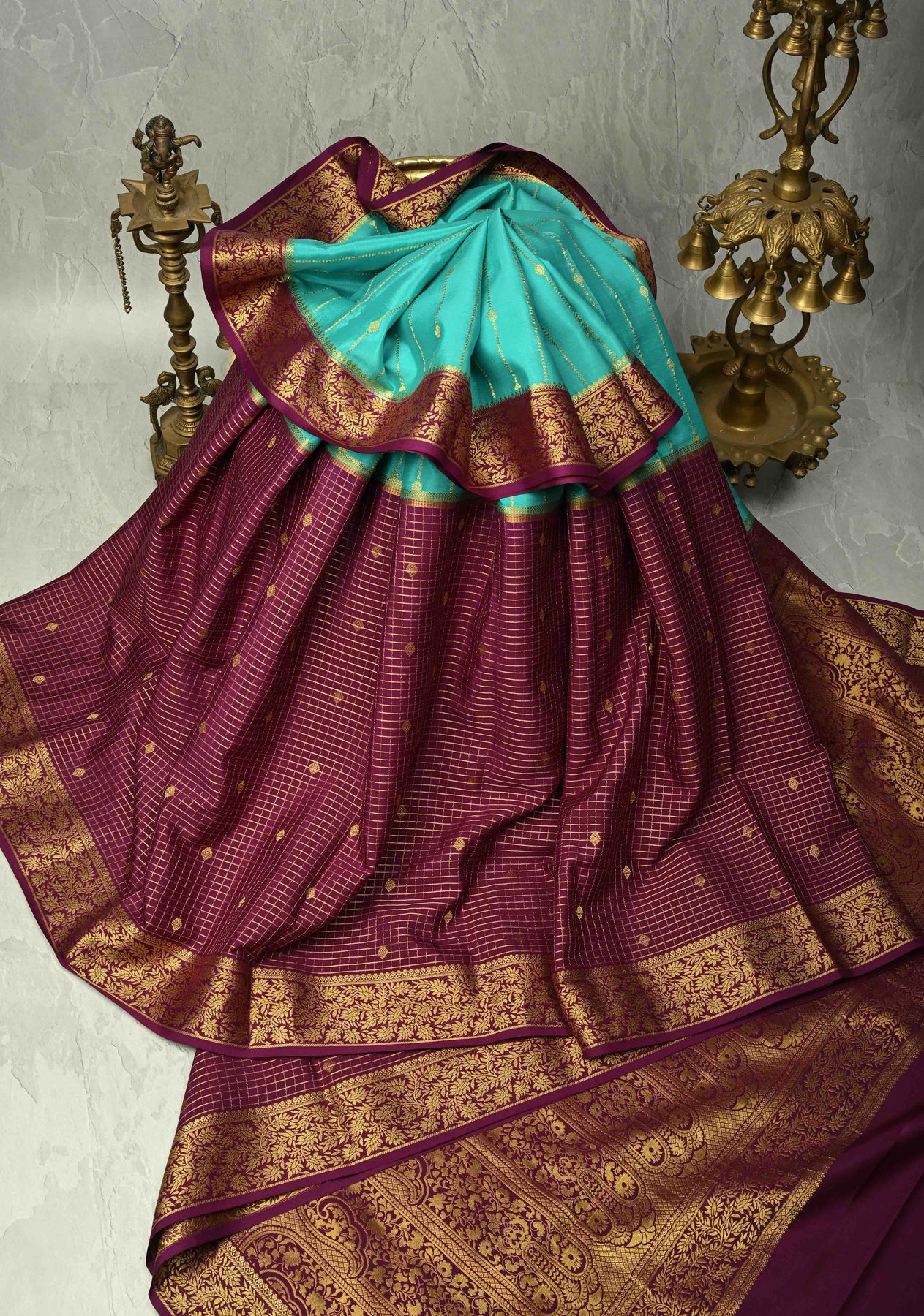 KSIC Grade Thickness Turquoise and Purple Vertical Stripes Mysore Silk Saree with Zari Butta and Half Checks Border | SILK MARK CERTIFIED
