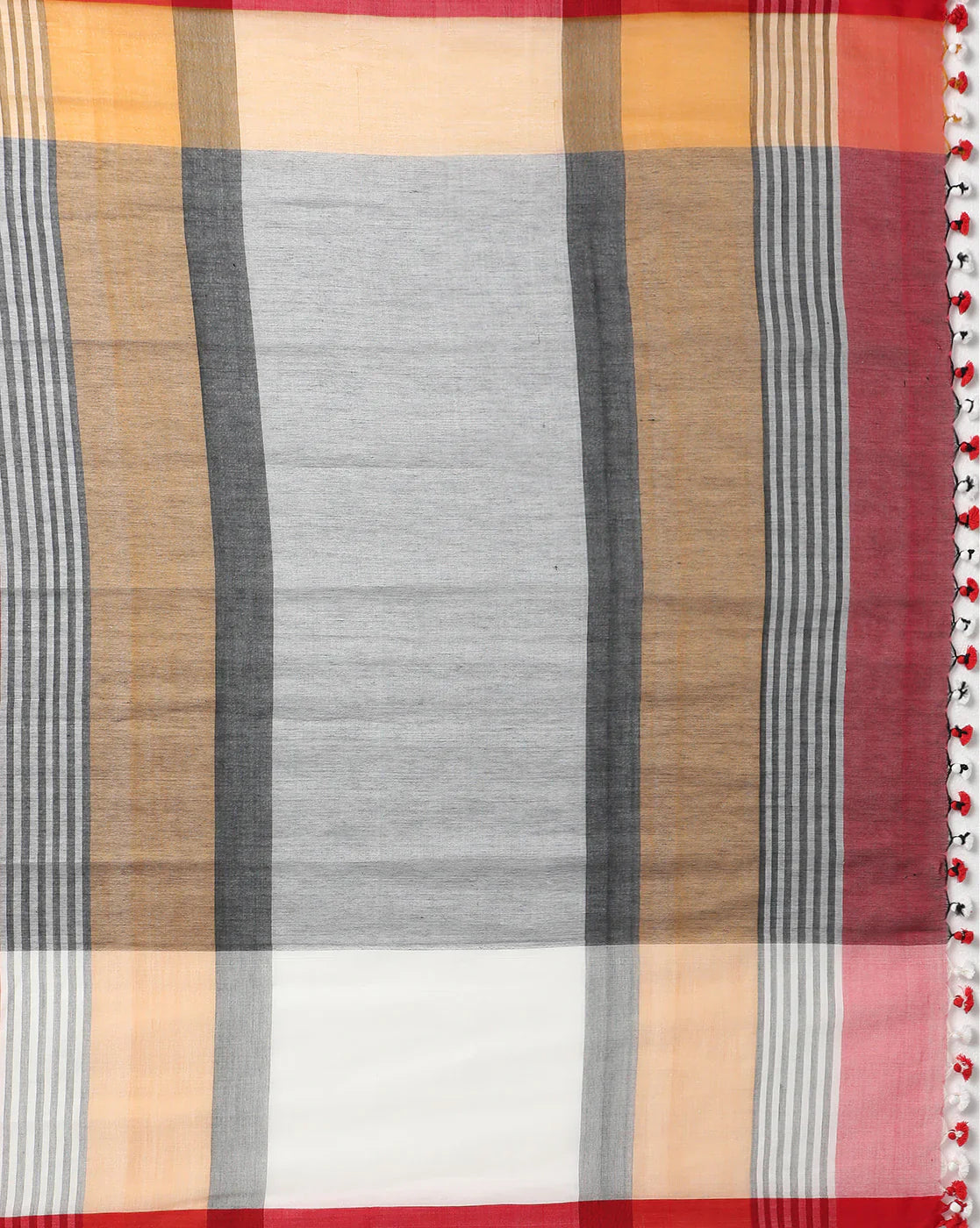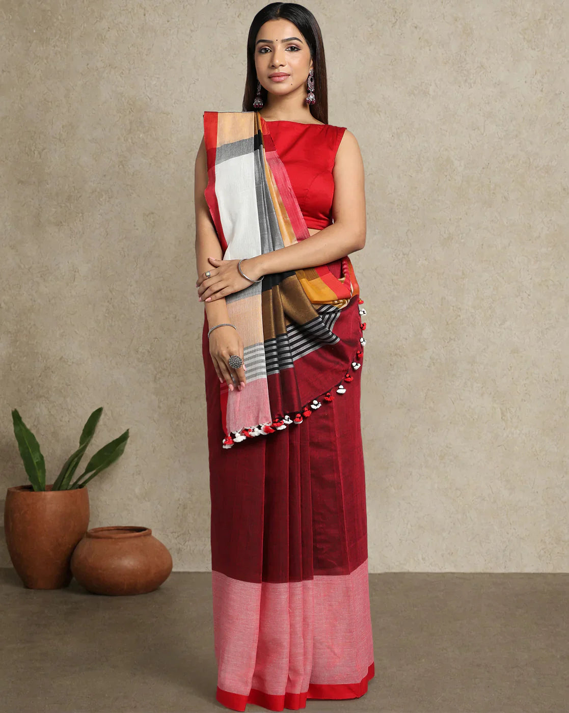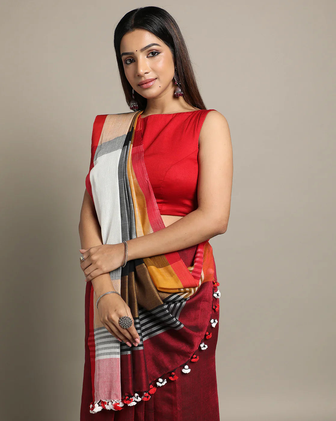 This Maroon-Gray Handloom Colour Block Cotton Saree is a perfect fusion of modern aesthetics and traditional craftsmanship. Handwoven from soft, breathable cotton, it features a striking colour-block design in maroon and subtle gray tones. The minimalist pattern and smooth texture lend it a contemporary yet elegant appeal. Lightweight and easy to drape, this saree is ideal for office wear, casual outings, or cultural events where effortless style meets comfort.