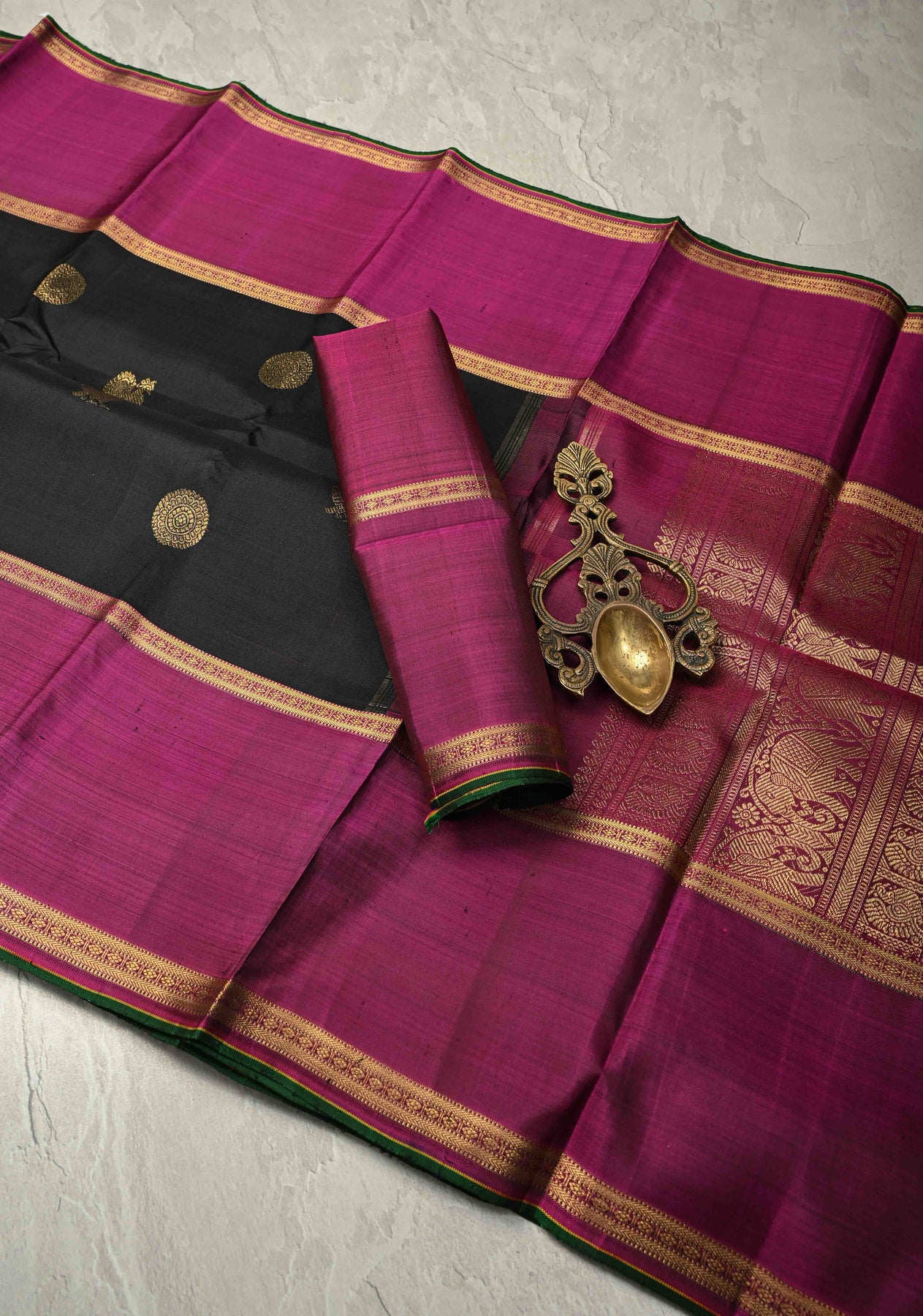 This elegant black handloom pure silk Kanchipattu saree is a timeless expression of South Indian craftsmanship. Woven from pure silk, the saree features delicately placed zari buttas that shimmer subtly against the rich black body, adding a touch of refined grandeur. The highlight of the saree is its striking contrast Rettaipet zari border, intricately woven with traditional motifs that lend depth and regal charm to the drape. Finished with a beautifully coordinated pallu and blouse, this classic Kanchipattu saree is perfect for festive occasions, and heritage celebrations, embodying grace, tradition, and luxury in every fold.