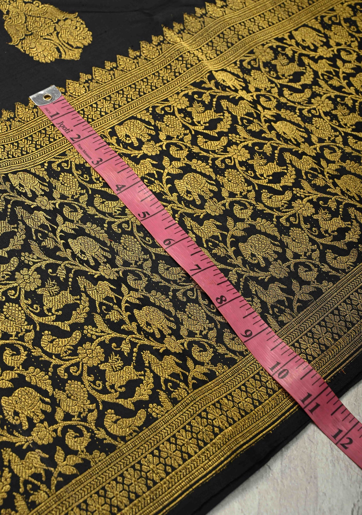 Embrace the timeless majesty of our Black Handloom Pure Silk Kanchipattu Saree, a masterpiece of traditional Dravidian artistry. The deep ebony body is adorned with intricate Peacock Buttas, symbolizing grace and beauty. It features a spectacular Vanasingaram wide zari border, intricately woven with "forest glory" motifs including elephants, and birds. Handcrafted from premium pure silk, this regal saree is the ultimate choice for grand weddings and heirloom collections, offering an unmatched silhouette of power and elegance.