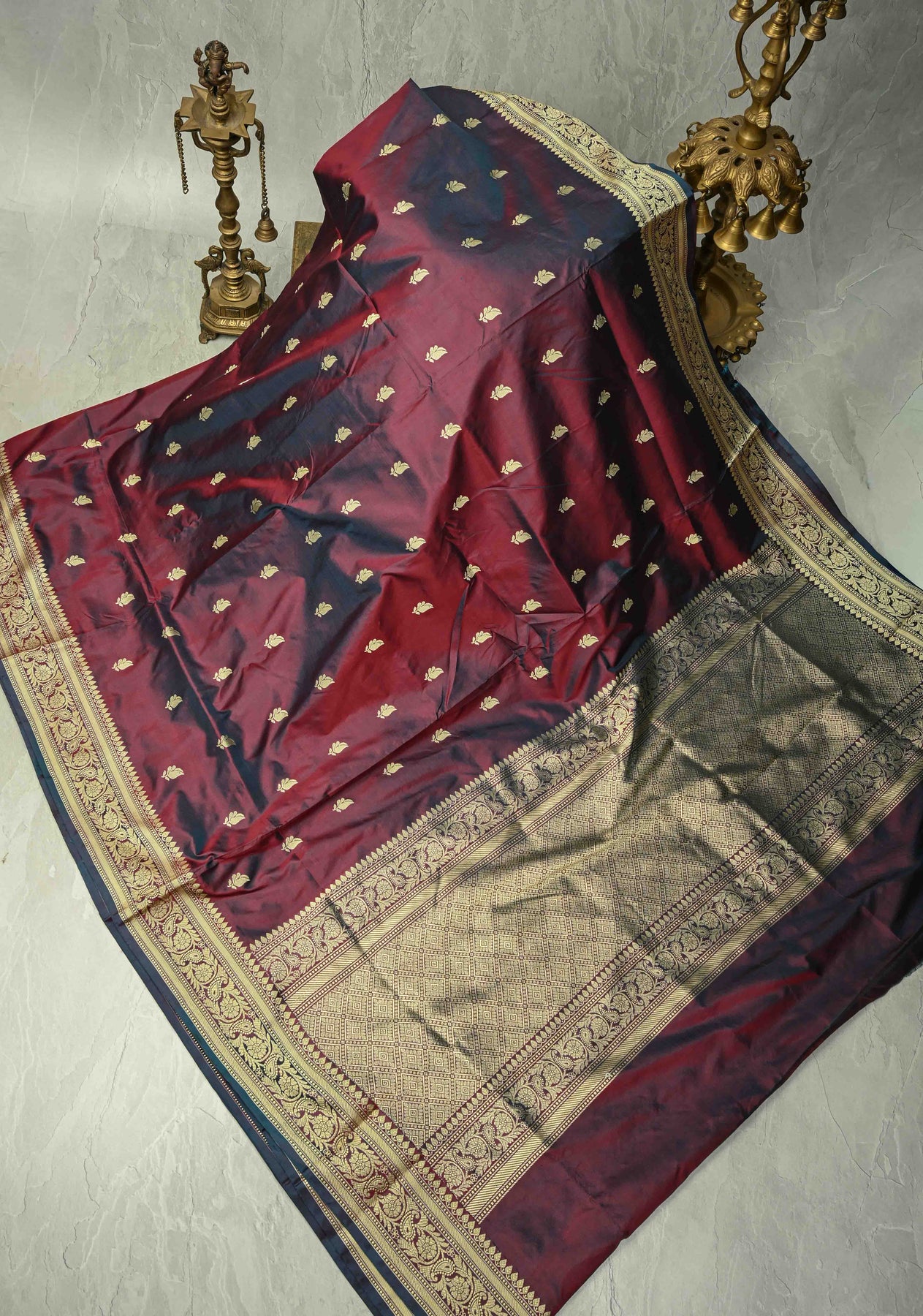 This Burgundy Dual Tone Lightweight Banarasi Katan Silk Saree is a stunning fusion of elegance and tradition. Crafted from Katan silk, it boasts a subtle sheen and smooth drape, making it comfortable yet luxurious. The saree is adorned with delicate Resham buttas intricately woven across its body, while the contrasting Banarasi border adds a regal touch with exquisite detailing. Its dual-tone design enhances depth and sophistication, making it perfect for weddings, festive celebrations, and special occasions. Lightweight and graceful, this saree is a timeless addition to any ethnic wardrobe.