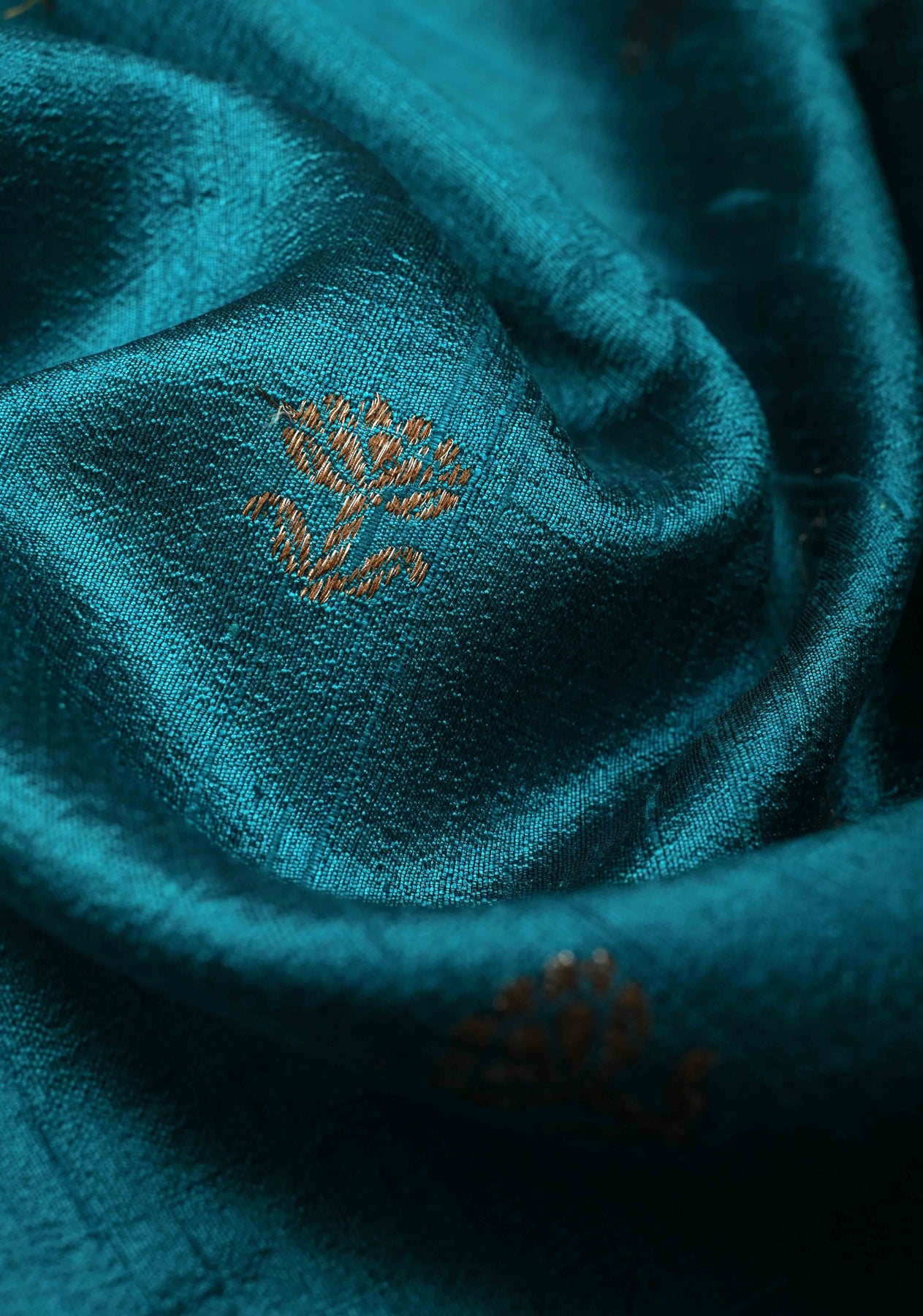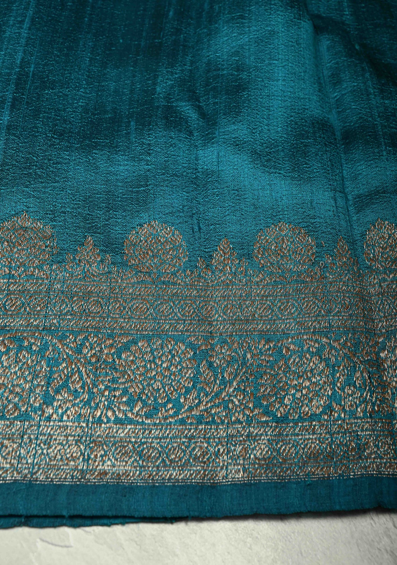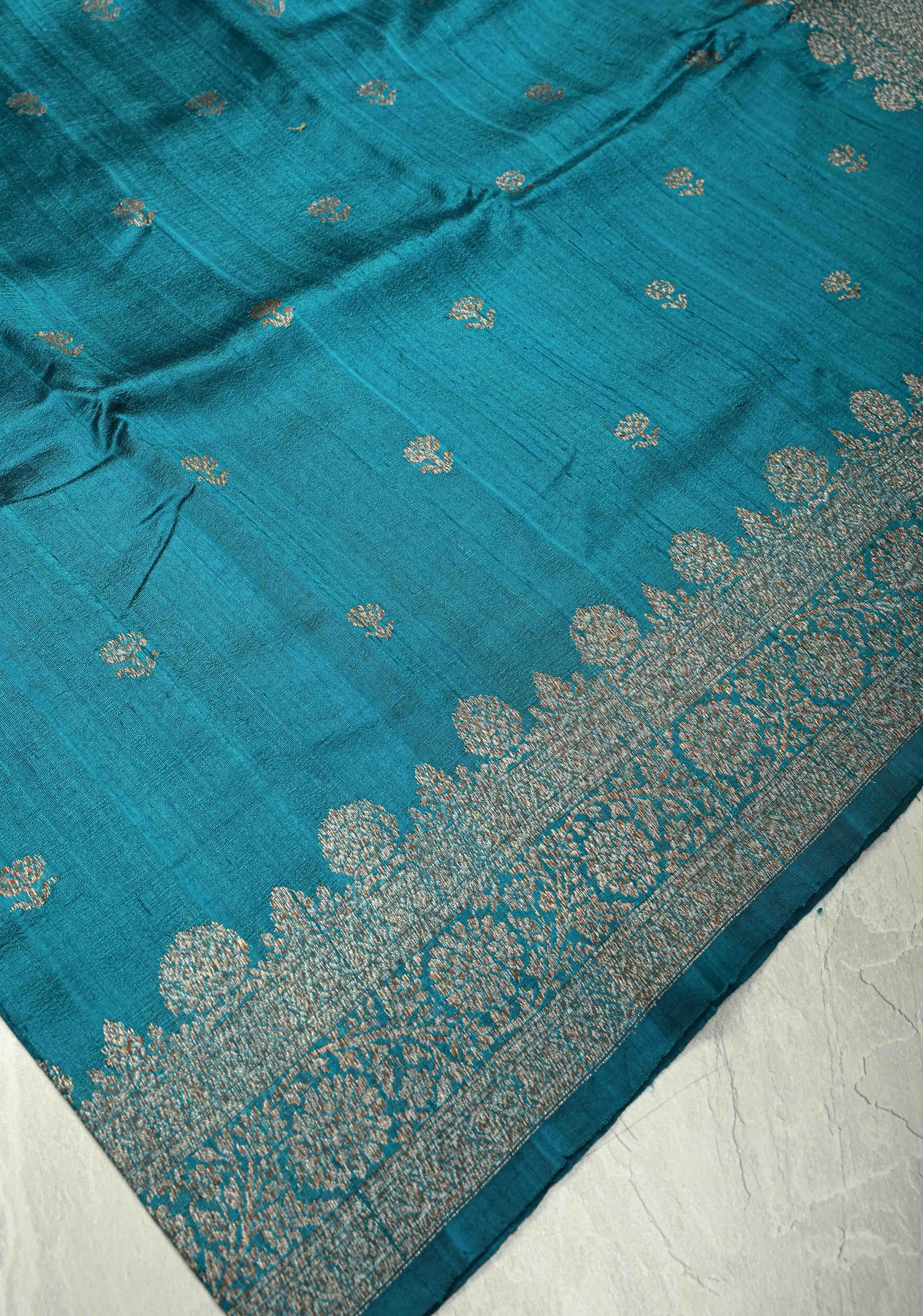 This magnificent Copper Sulphate Blue Banarasi Raw Silk Saree is a masterpiece of elegance and traditional craftsmanship. Woven from raw silk, it features a copper sulphate blue hue that radiates depth and sophistication. The saree is adorned with intricately woven antique silver zari buttas that shimmer gracefully across the fabric, adding a touch of regal charm. A finely crafted antique silver zari border completes the look, enhancing its opulent appeal. Perfect for weddings, festive occasions, and grand celebrations, this saree beautifully combines classic Banarasi artistry with a modern, timeless elegance.