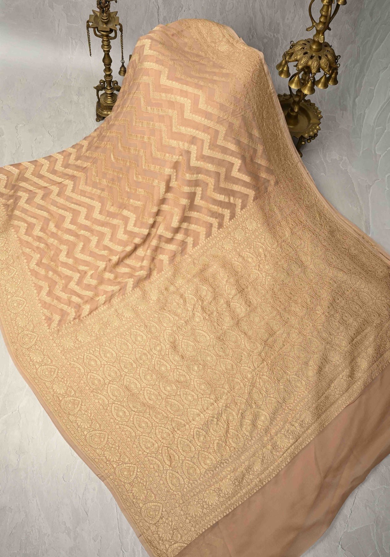 Elegant and effortlessly stylish, this Cream Banarasi Georgette Silk Saree beautifully blends contemporary design with traditional craftsmanship. Crafted from lightweight georgette silk, it features striking chevron patterns that add a modern, geometric flair to its soft and fluid drape.