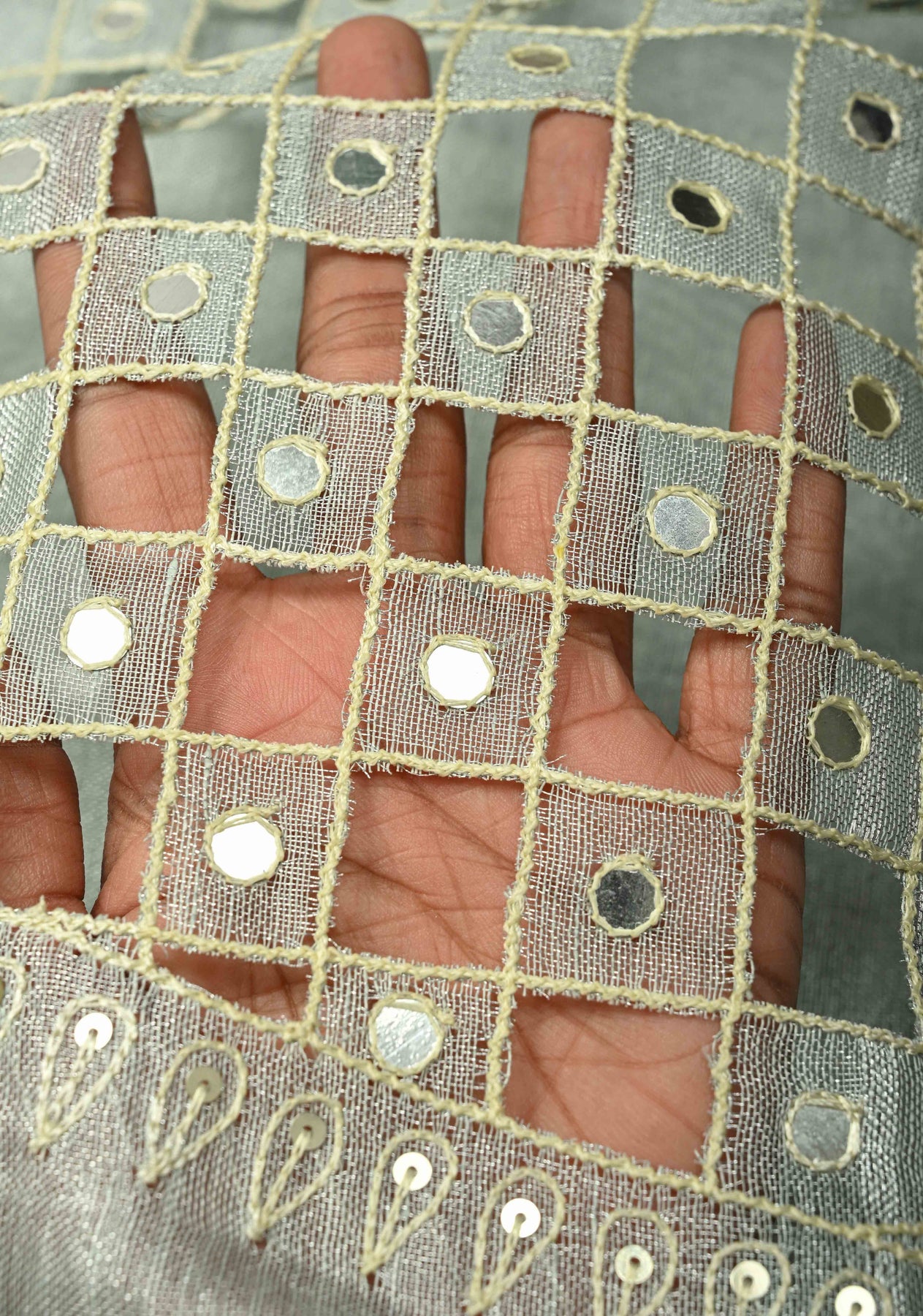 Cutwork and Mirror Work Tissue Linen Saree in Silver with Dramatic Fancy net Tassels