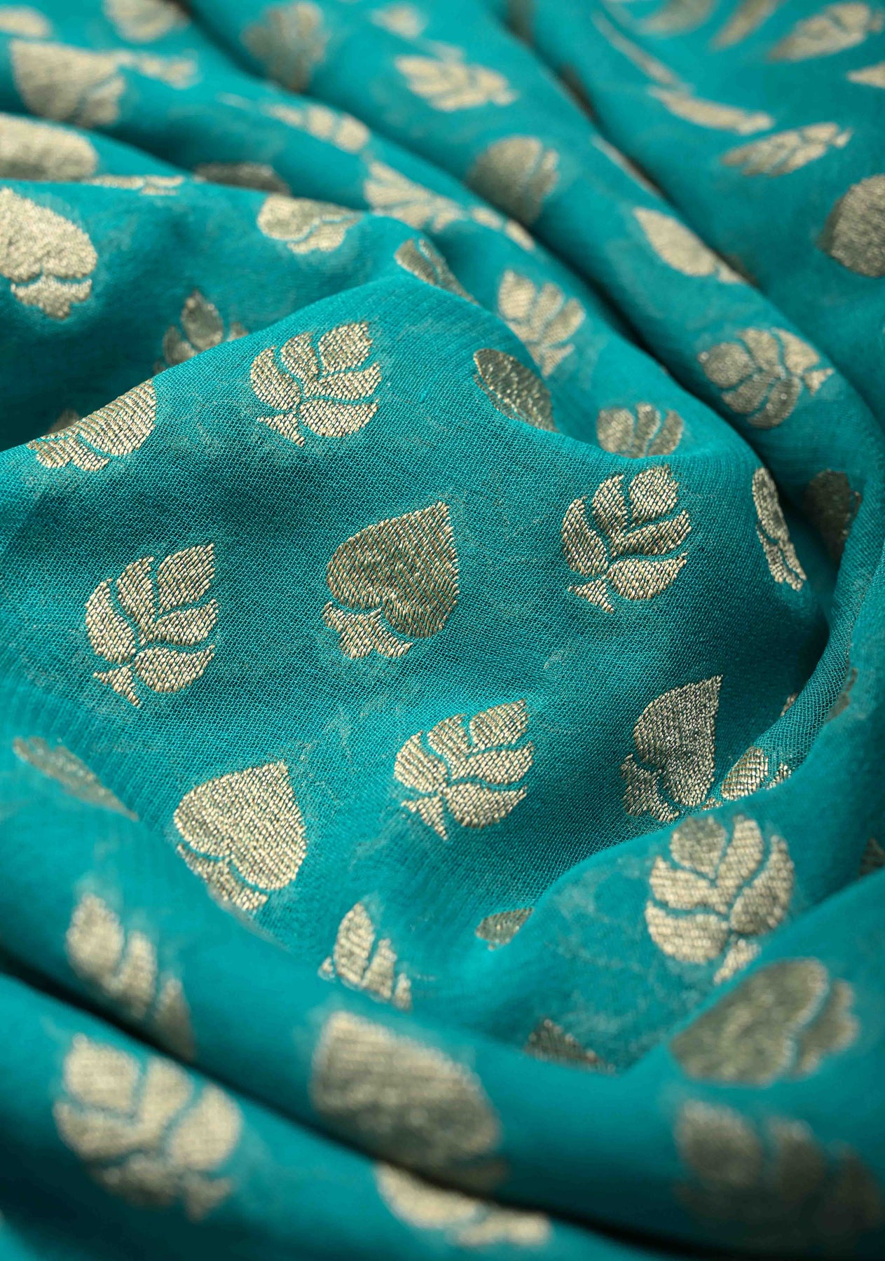 Drape yourself in timeless elegance with this exquisite Banarasi georgette silk saree. The fabric's fluid drape and luxurious sheen offer both comfort and sophistication. The saree's body is adorned with delicate floral buttas meticulously woven throughout, adding a touch of classic femininity and intricate detail. A shimmering zari border frames the saree, providing a rich contrast and a touch of traditional Banarasi opulence. This piece is a perfect fusion of timeless design and contemporary comfort, ideal for any special occasion.