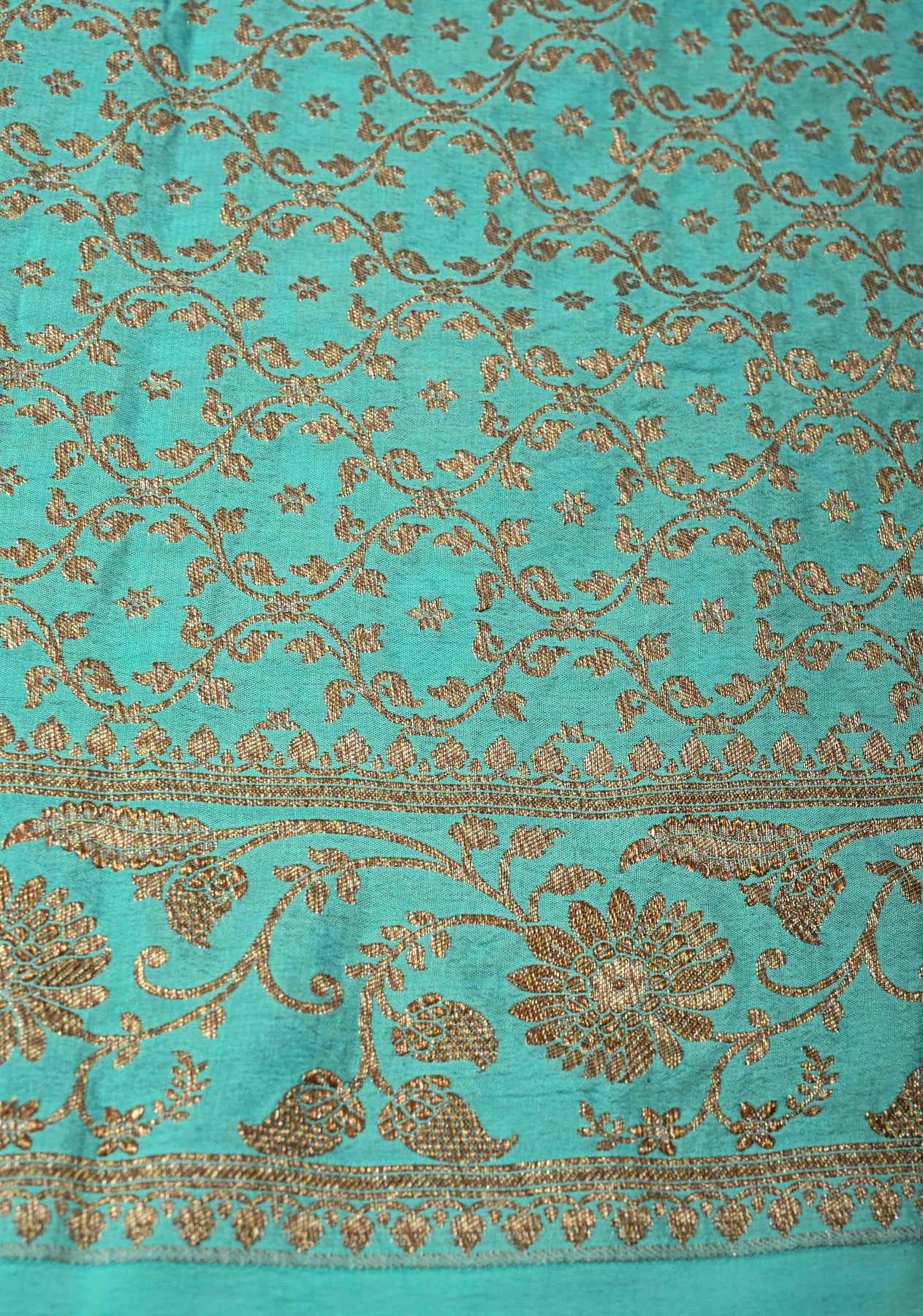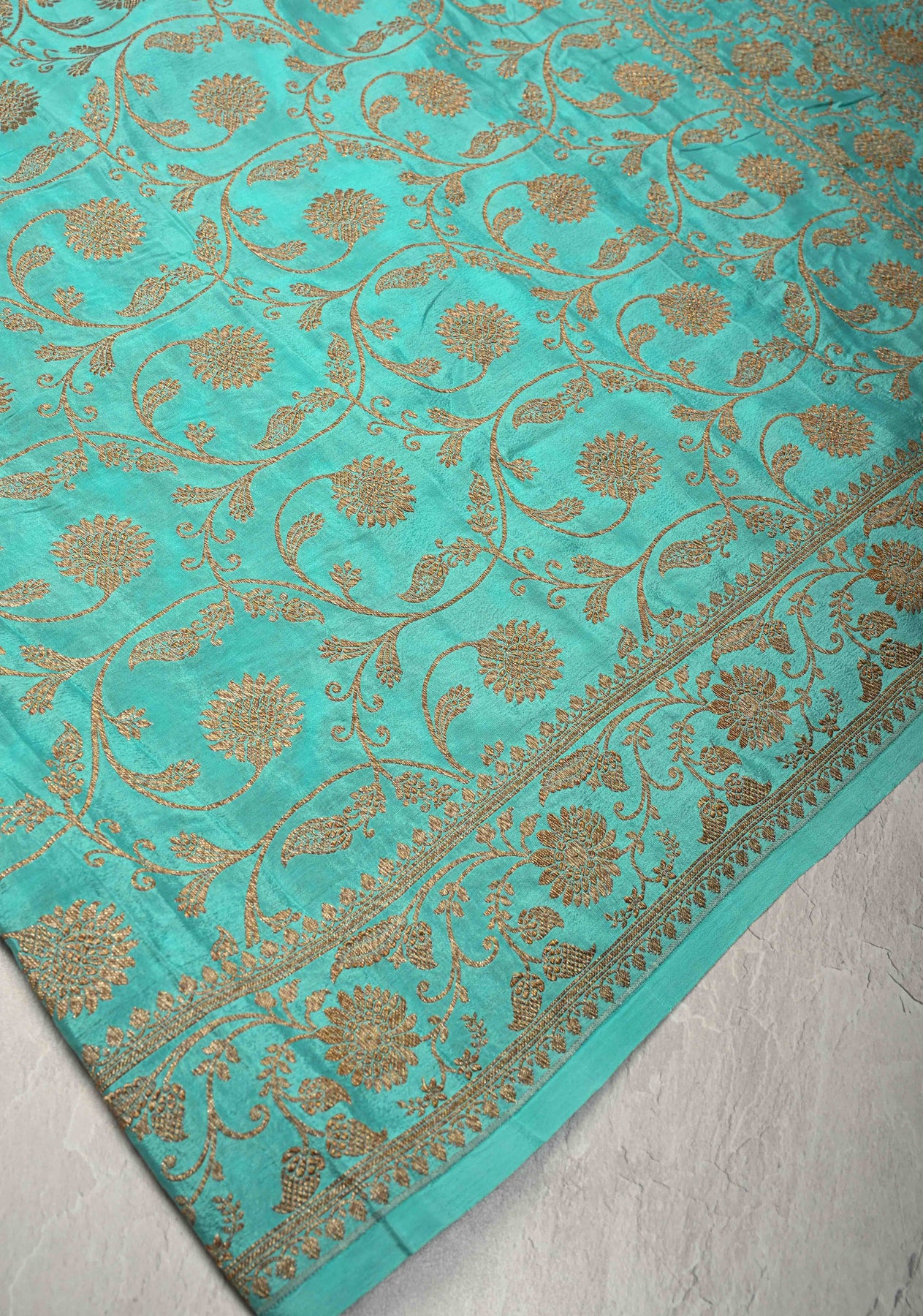 The striking cyan hue adds a fresh and uplifting charm, while the intricately woven floral brocade jaal zari border lends a regal finish. Delicate craftsmanship meets understated sophistication, making this saree a perfect choice for festive occasions, traditional ceremonies, or formal celebrations.