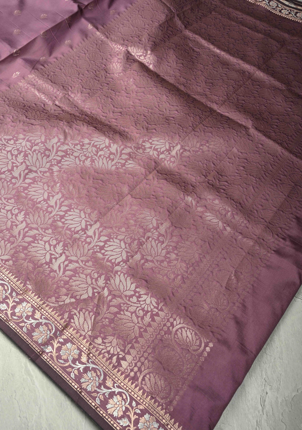 The Dark Mauve Semi Silk Saree with Floral Buttas and Alfi Zari Border is an exquisite blend of elegance and understated charm. The dark mauve color offers a sophisticated and timeless appeal, while the floral buttis delicately embroidered across the saree add a touch of intricate beauty. The semi-silk fabric provides a luxurious sheen and soft drape, making it both comfortable and graceful to wear. The saree is framed with an Alfi zari border that adds a subtle sparkle, elevating the design with a traditional yet modern touch. Ideal for weddings, receptions, or festive gatherings, this saree is a perfect choice for those who seek a refined, elegant look with a hint of glamour.