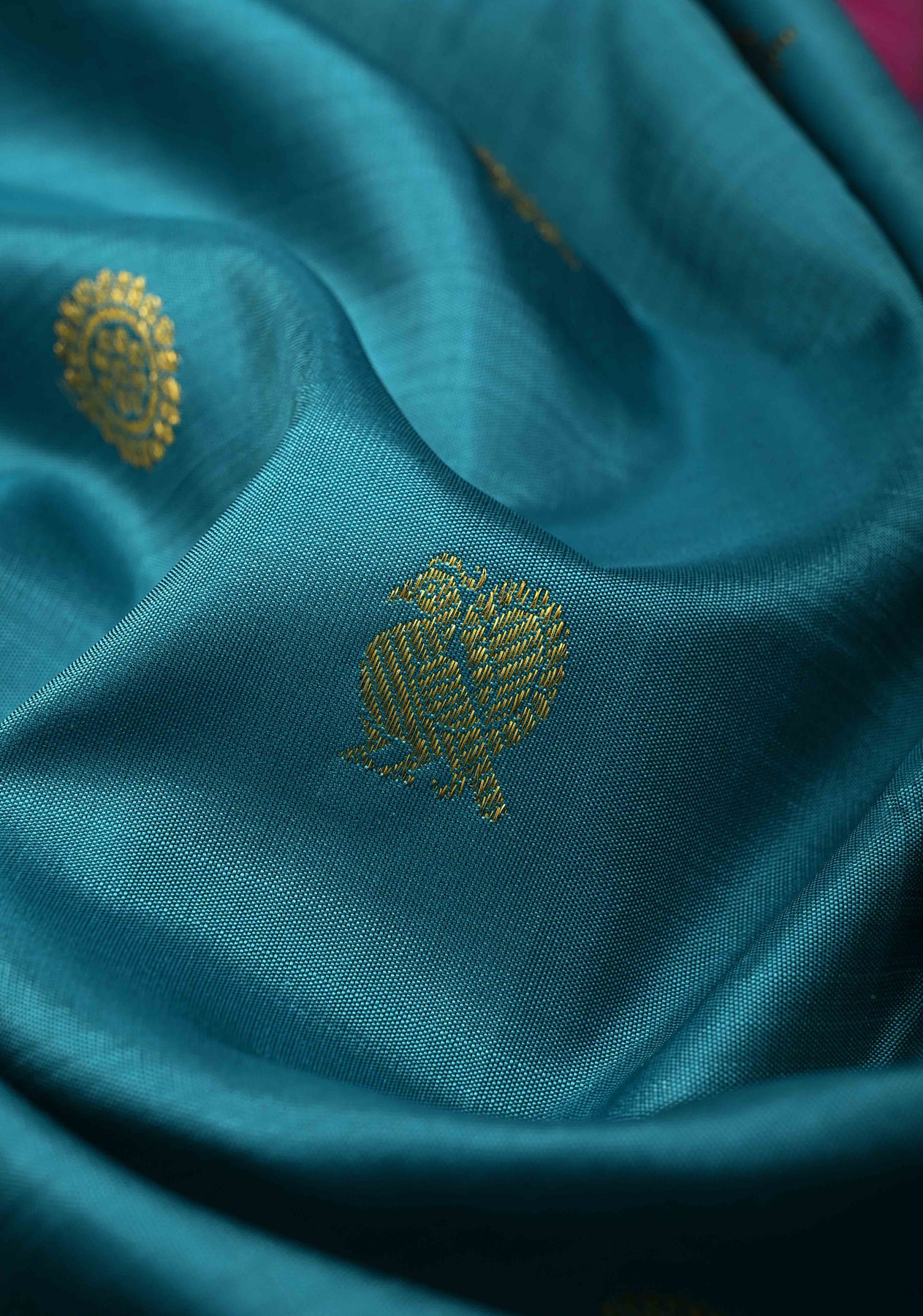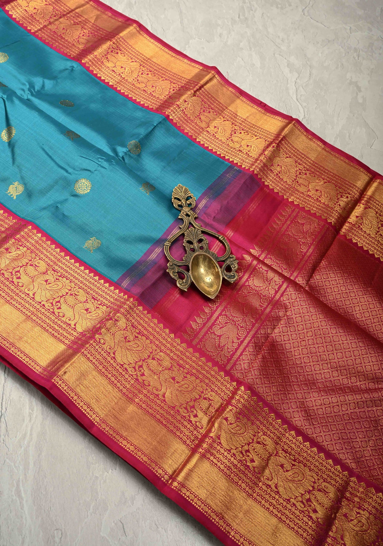 Captivate the room in our Teal Blue Kanjivaram Pure Silk Saree, a stunning blend of modern poise and ancient artistry. The deep, peacock-toned teal body is elevated by delicate gold zari buttas, adding a shimmering texture to the luxurious silk. A magnificent contrast zari border in a rich, vibrant hue frames the drape, featuring intricate traditional motifs. Handcrafted by master weavers, this saree offers a majestic fall, making it an exquisite choice for grand weddings.