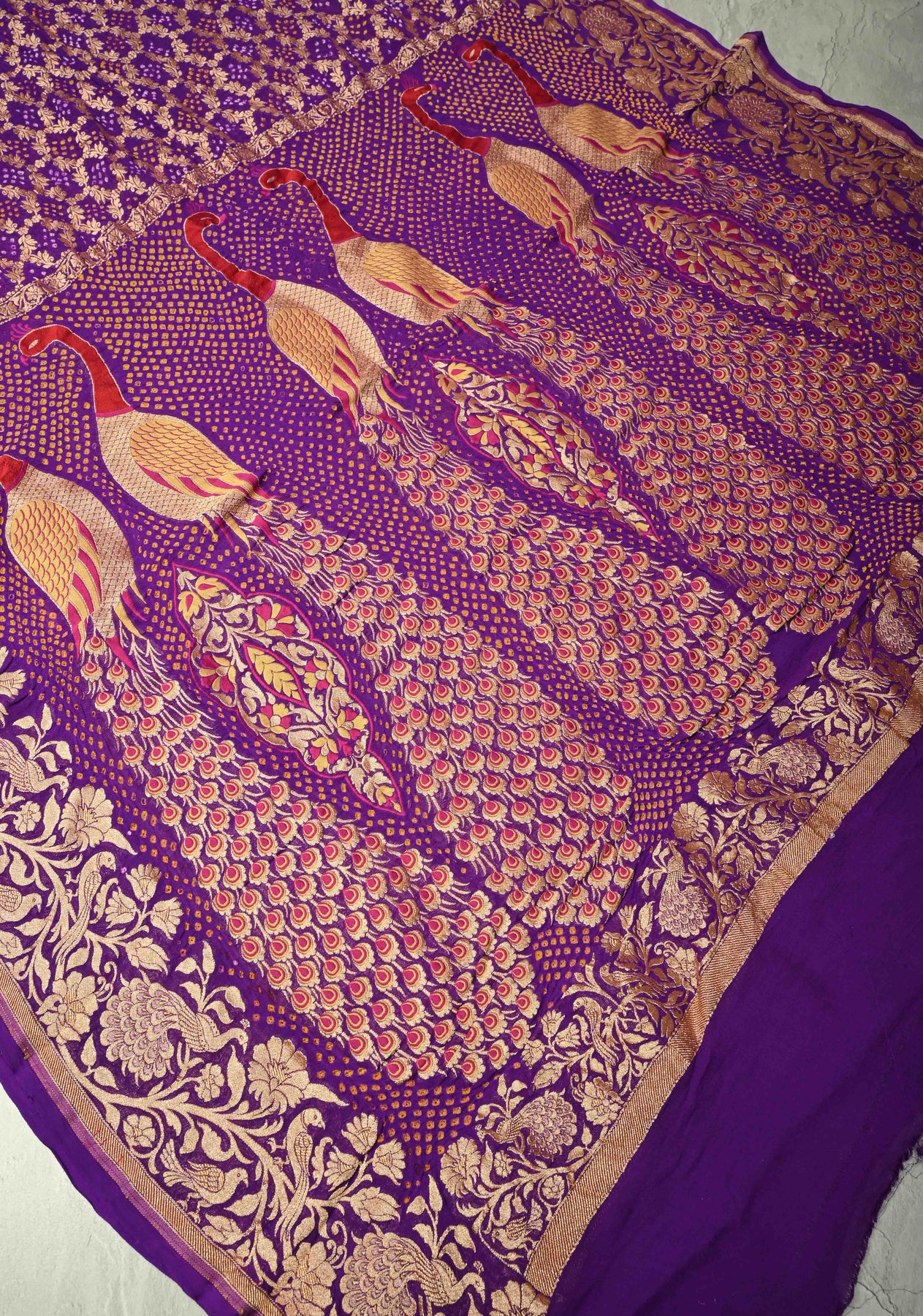 This stunning dupatta is a masterpiece of Indian textile artistry, blending several rich traditions. The vibrant bright red hue, a classic for celebrations, is beautifully presented on a luxurious pure silk georgette fabric. The body features an authentic hand-Bandhej tie-dye pattern, which is intricately woven with a Jaal zari design. The pallu is the highlight, adorned with a magnificent peacock design and vibrant Meenakari work, creating a captivating and detailed piece. This handwoven dupatta is a perfect fusion of heritage and sophisticated style, ideal for weddings and grand celebrations.