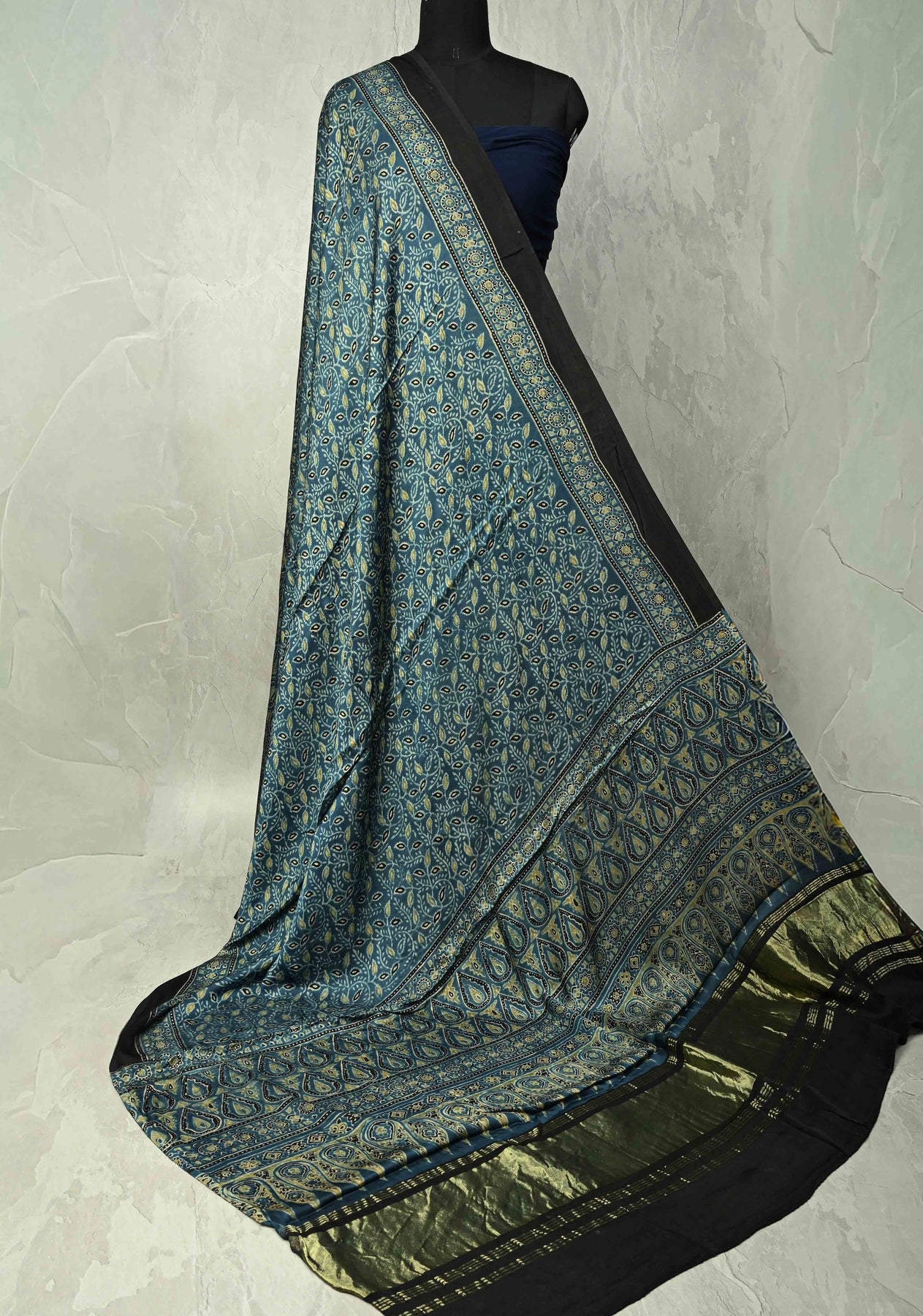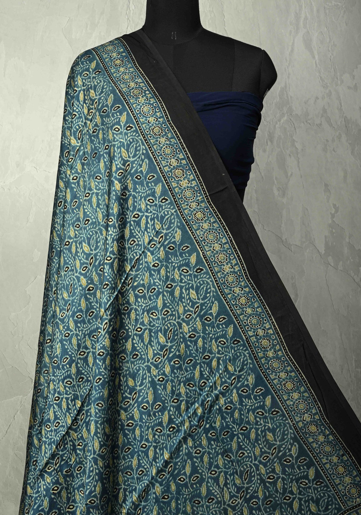 Immerse yourself in the beauty of handcrafted elegance with this Indigo Pure Modal Silk Dupatta. Made from luxuriously smooth and lustrous pure modal silk, this dupatta features intricate Ajrakh hand block printing, a centuries-old craft known for its geometric motifs and natural dyes. The deep indigo base beautifully highlights the traditional patterns, while the Lagda patta (zari border) adds a refined metallic sheen, making it a timeless addition to your ethnic wardrobe
