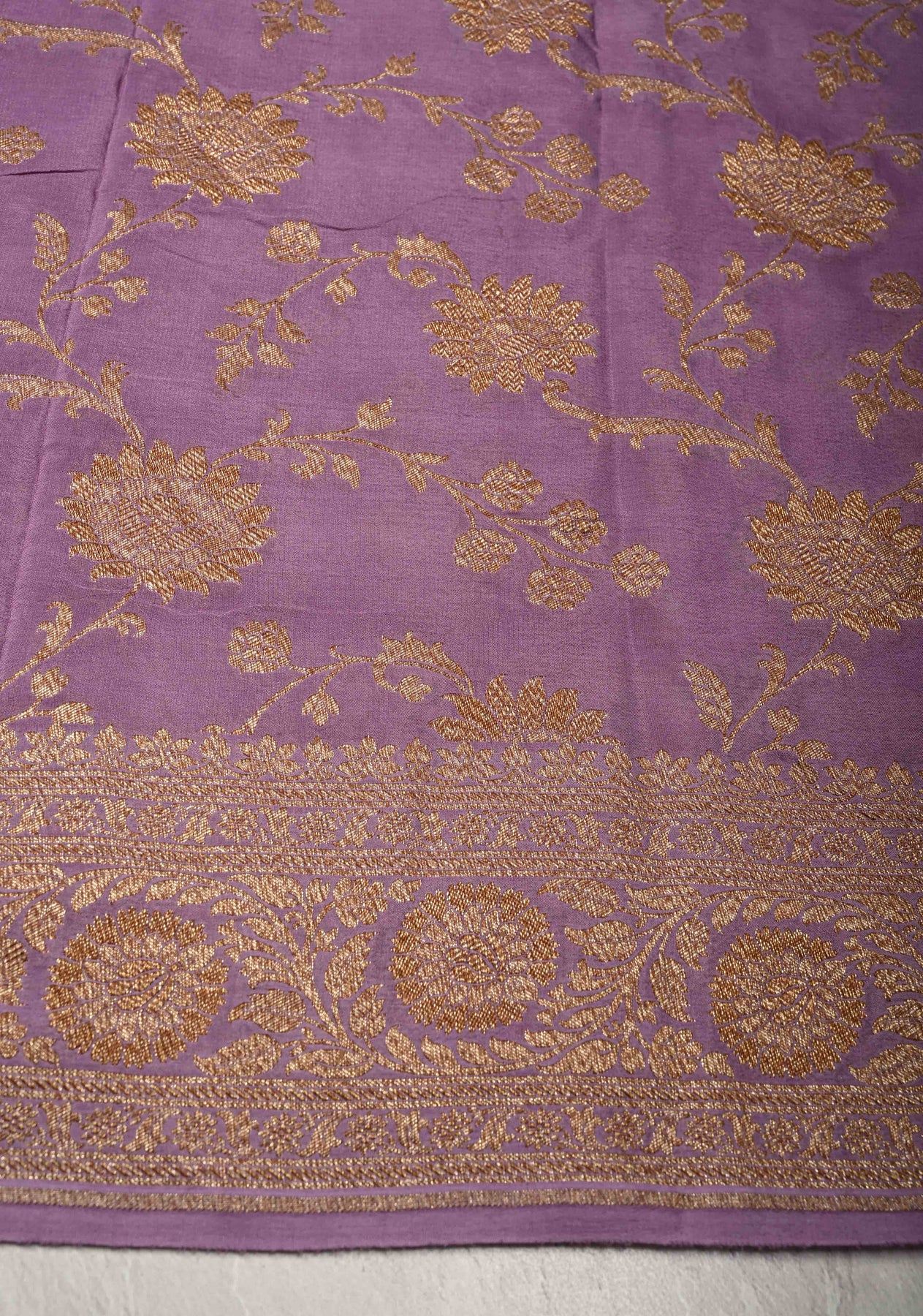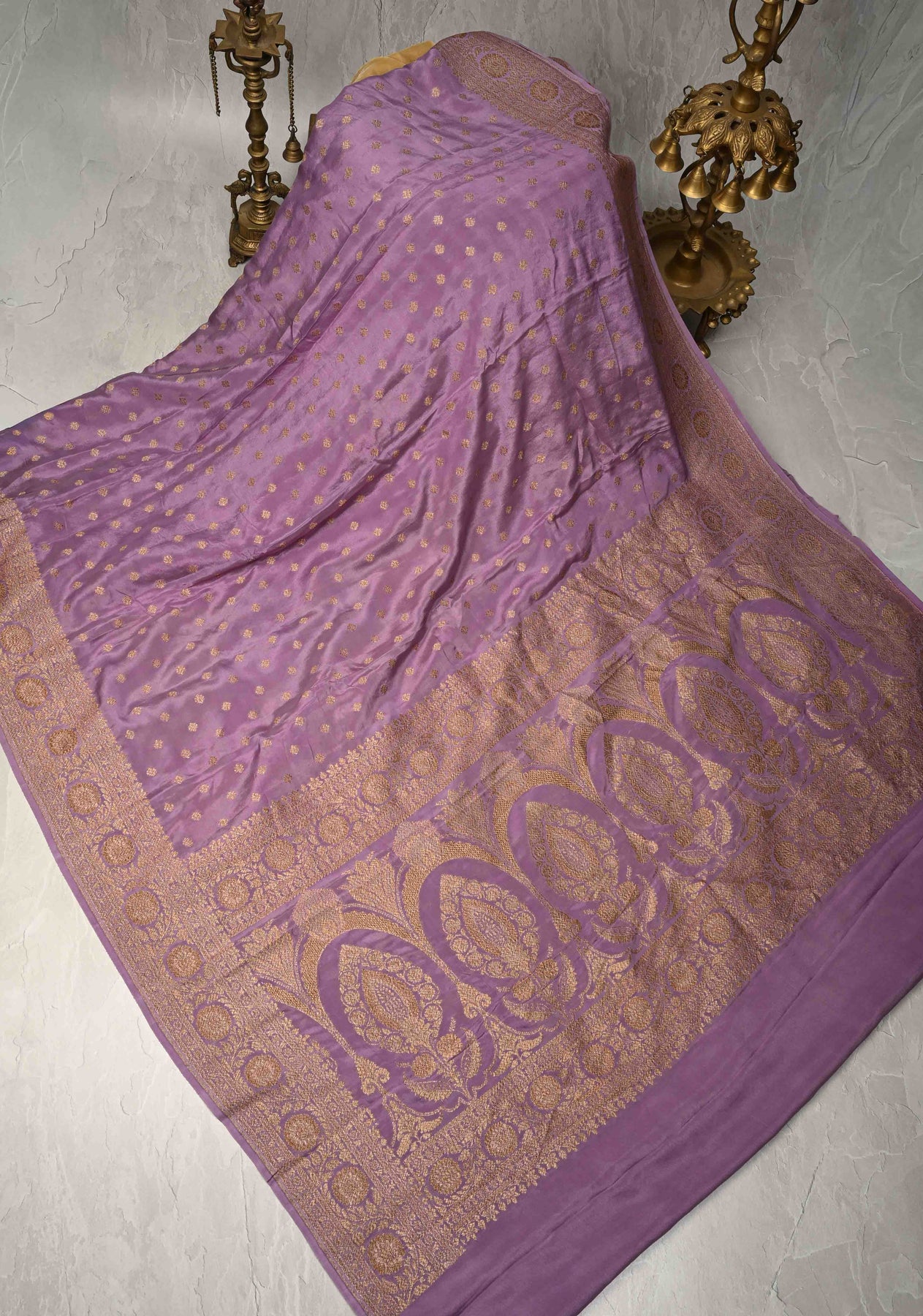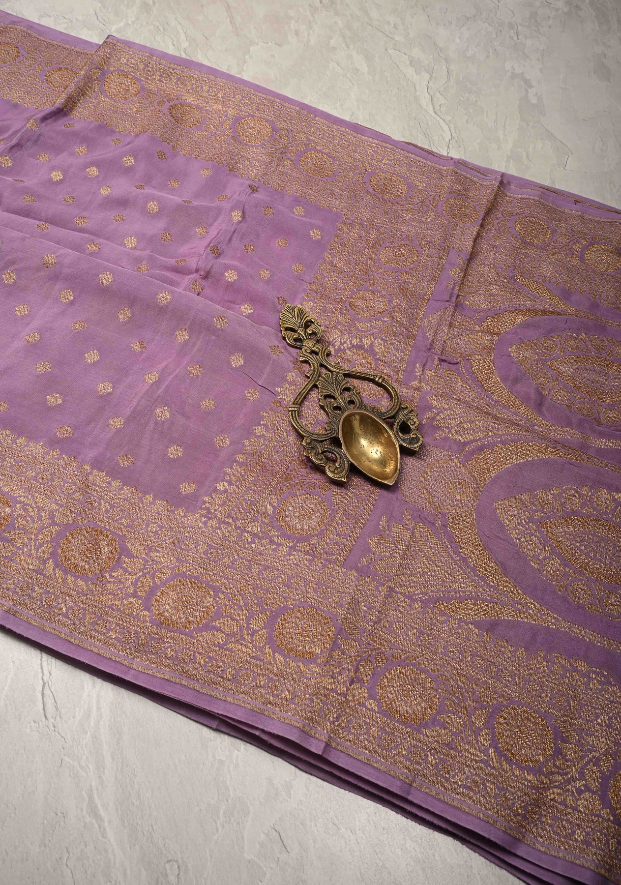 This Dusty Lavender Pure Mysore Crepe Silk Saree exudes understated elegance and classic charm. Crafted from soft Mysore crepe silk, it features delicate chunri buttis intricately woven throughout the fabric, adding a subtle yet captivating detail. The dusty lavender shade offers a serene and sophisticated appeal, beautifully complemented by a shimmering zari border that enhances the saree’s traditional allure. Perfect for weddings, festive occasions, and formal events, this saree promises grace and timeless beauty.