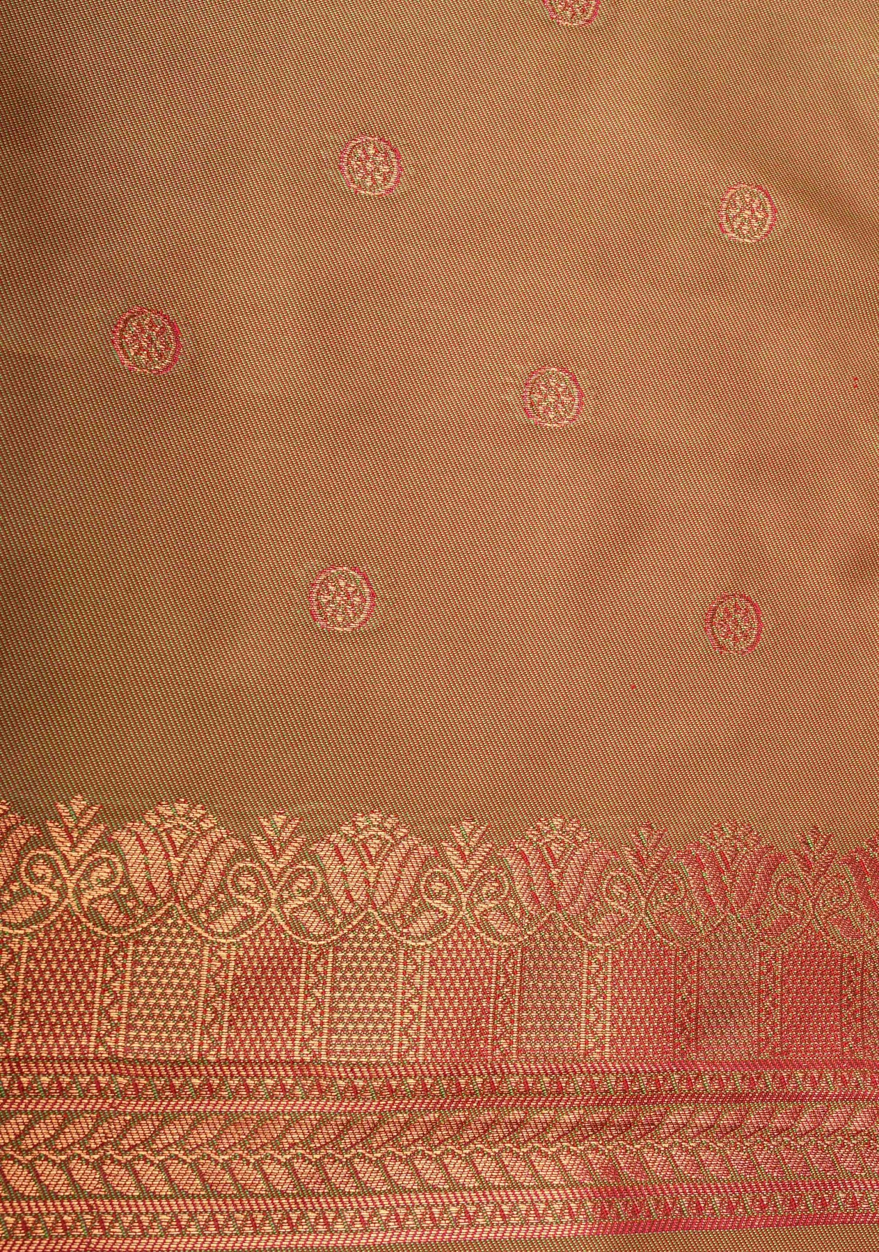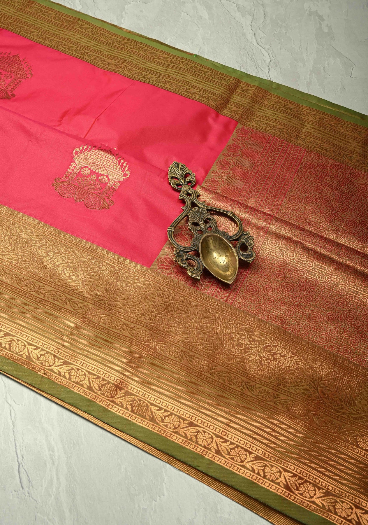 This Fiery Rose Kanchi semi-silk saree radiates vibrant elegance with its rich, captivating hue and luxurious sheen. The body is adorned with intricate zari buttas, adding a subtle sparkle that enhances the saree’s traditional charm. A beautifully woven contrast zari border frames the drape, showcasing classic Kanchi craftsmanship and elevating its regal appeal. Graceful, lightweight, and timeless, this saree is an exquisite choice for weddings, festive occasions, and special celebrations.