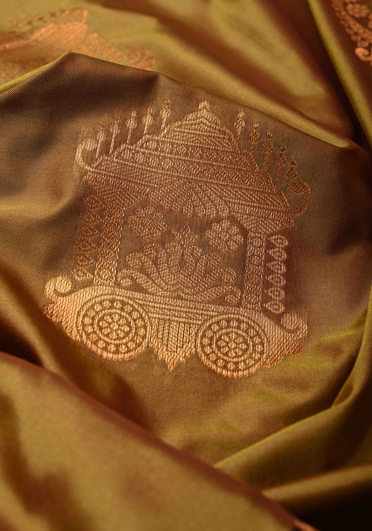 Golden Brown Dual Tone Kanchi Semi Silk Saree with Temple Chariot Zari Buttas and Contrast Wide Zari Border