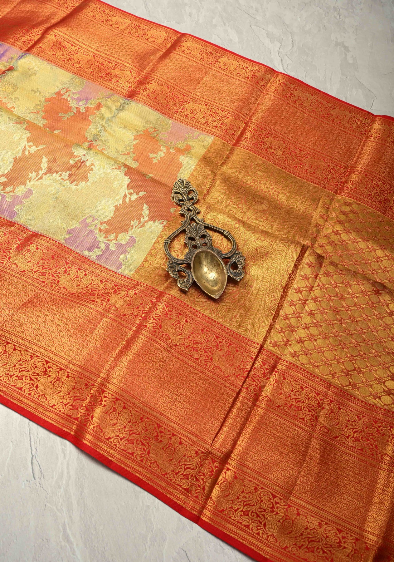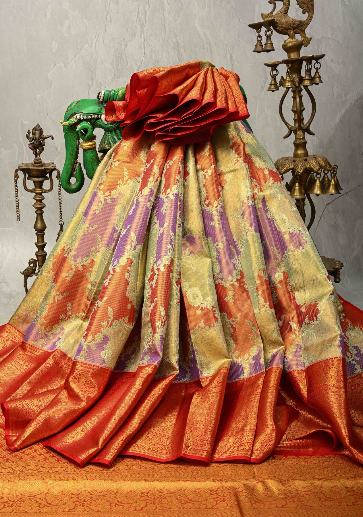 This enchanting multicolor pastel-hued Rangkaat style pure Kanjivaram tissue silk saree is a celebration of color, craftsmanship, and elegance. The tissue silk base showcases a harmonious blend of pastel shades woven in the traditional Rangkaat technique, creating a graceful color-play across the body. Adorned with intricate Meenakari floral jaal motifs, the saree exudes artistic richness and refined charm. A beautifully crafted contrast zari border frames the saree with regal finesse, while the detailed zari pallu completes the look. Perfect for weddings, festive occasions, and statement celebrations, this saree reflects timeless Kanjivaram heritage with a contemporary pastel allure.