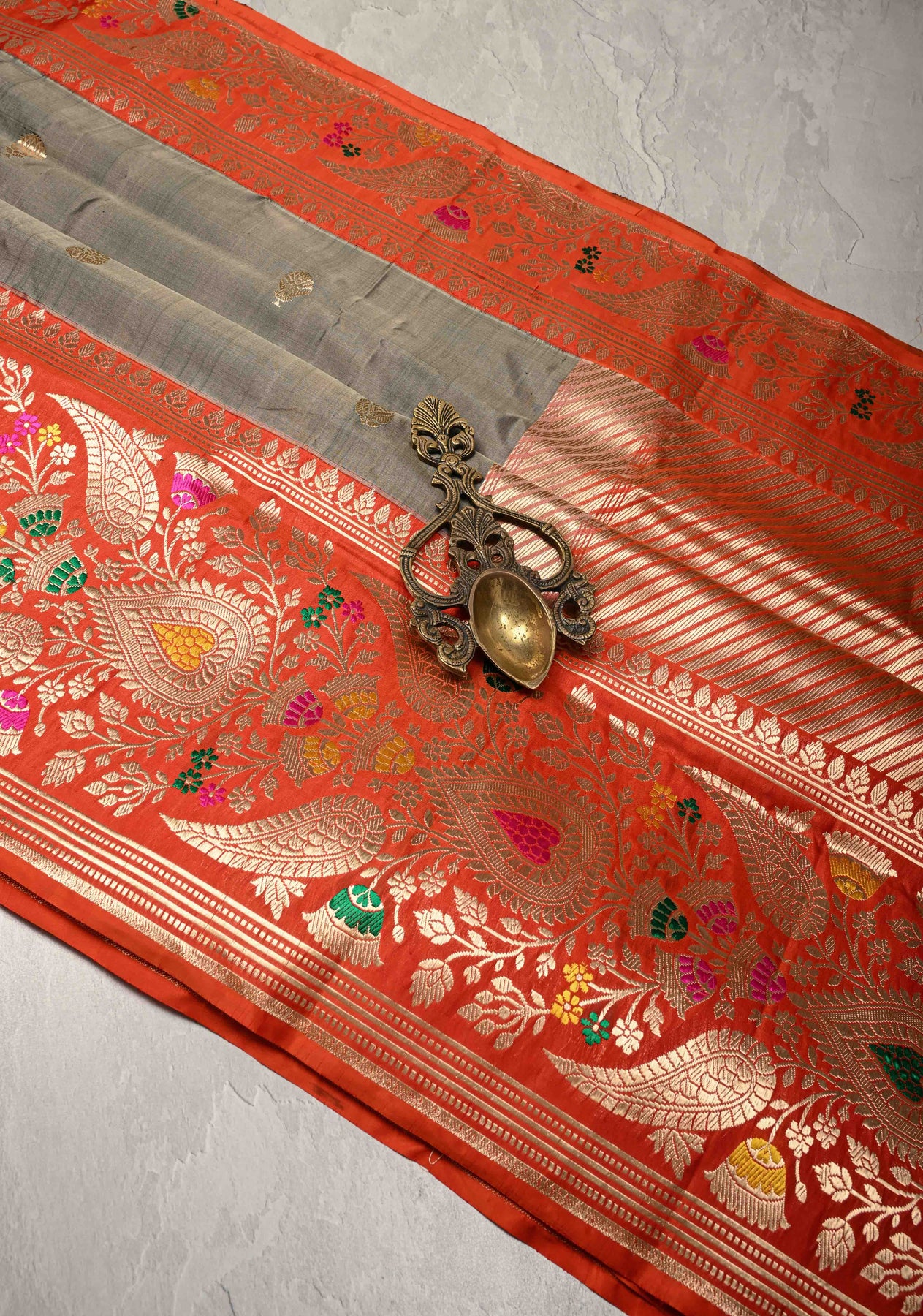 Grey Pure Banarasi Katan Silk Saree with Floral Zari Buttas and Contrst  Meenakari Wide Border | SILK MARK CERTIFIED