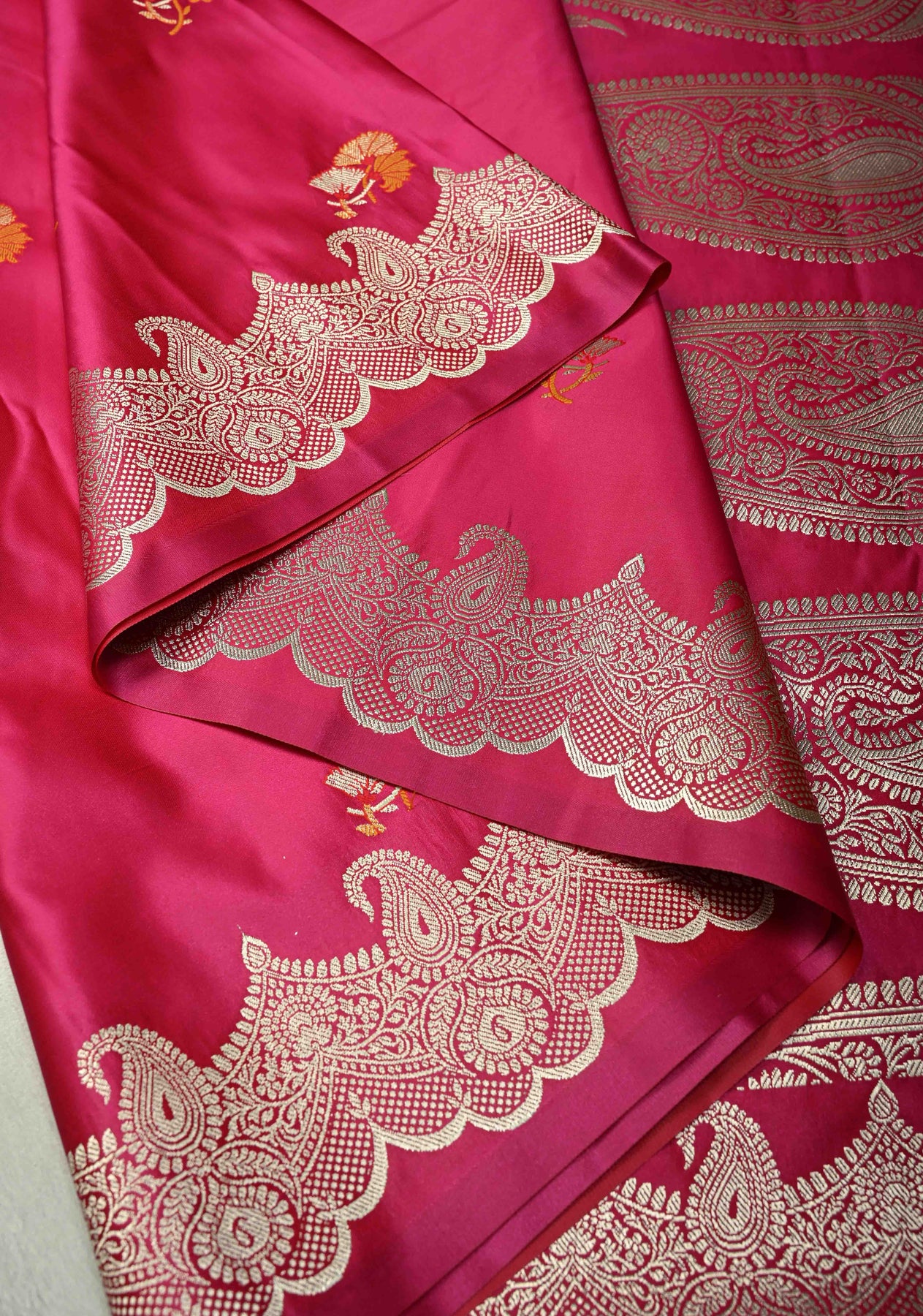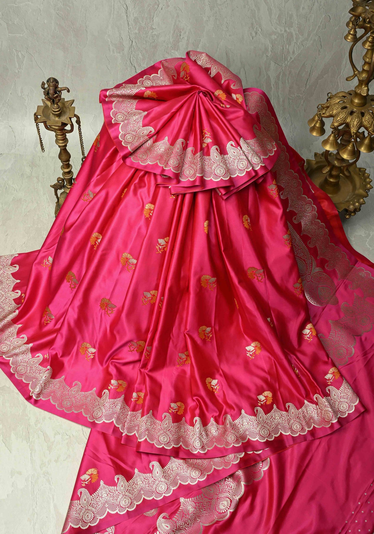 Hot Pink Banarasi Semi Mashru Silk Saree with Meenakari Zari Buttas and Floral Scallop Zari Border