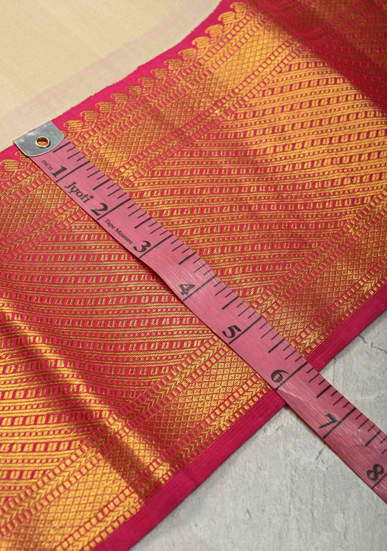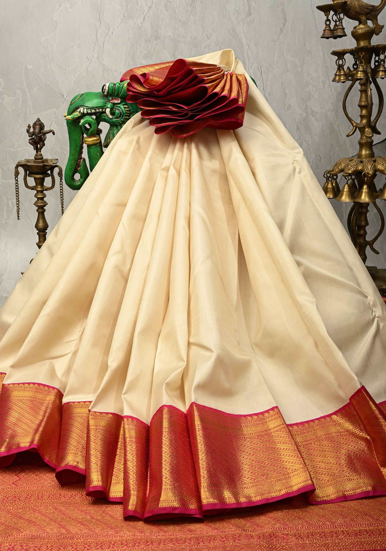 This ivory pure Kanjivaram silk saree exudes timeless sophistication and understated elegance. Crafted from silk, its pristine ivory body offers a serene and graceful appeal, perfectly complemented by a contrast korvai zari border that adds depth, structure, and regal charm. Ideal for weddings, festive occasions, and traditional celebrations, this saree reflects the exquisite craftsmanship and heritage artistry of authentic Kanjivaram weaving.