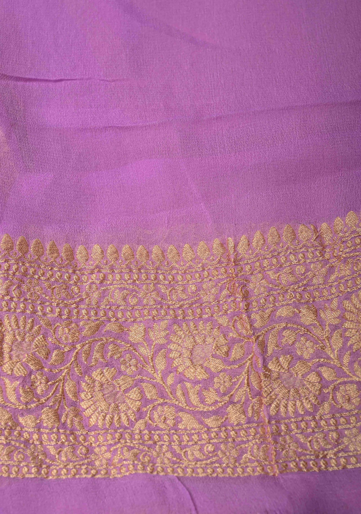 Graceful and refreshing, this Lavender Banarasi Georgette Silk Saree is a perfect blend of traditional charm and soft contemporary elegance. Woven from lightweight georgette silk, the saree features delicate zari buttis scattered across the body, adding a subtle shimmer to its flowy drape.