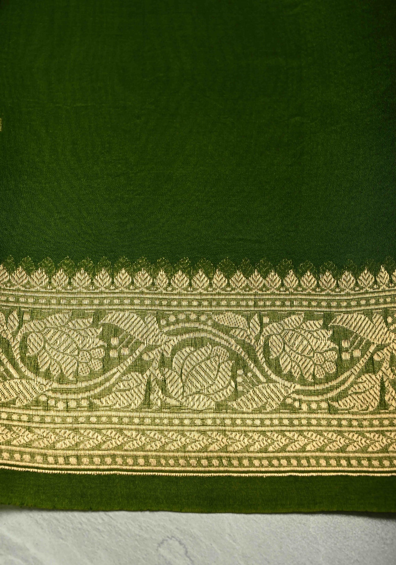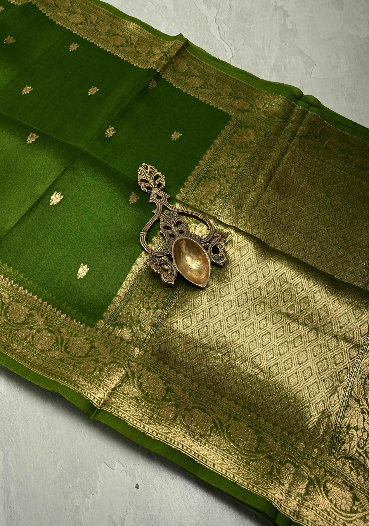 This Mehendi Green Pure Banarasi Kora Silk Saree is a timeless emblem of elegance and tradition. Woven from Kora silk, it features delicate Zari buttas gracefully scattered across the body, adding a subtle shimmer. The saree is accentuated with a rich Zari border, highlighting exquisite craftsmanship and classic Banarasi artistry. Lightweight and draping beautifully, it is perfect for weddings, festive occasions, and special celebrations, making it an essential piece for any ethnic wardrobe.