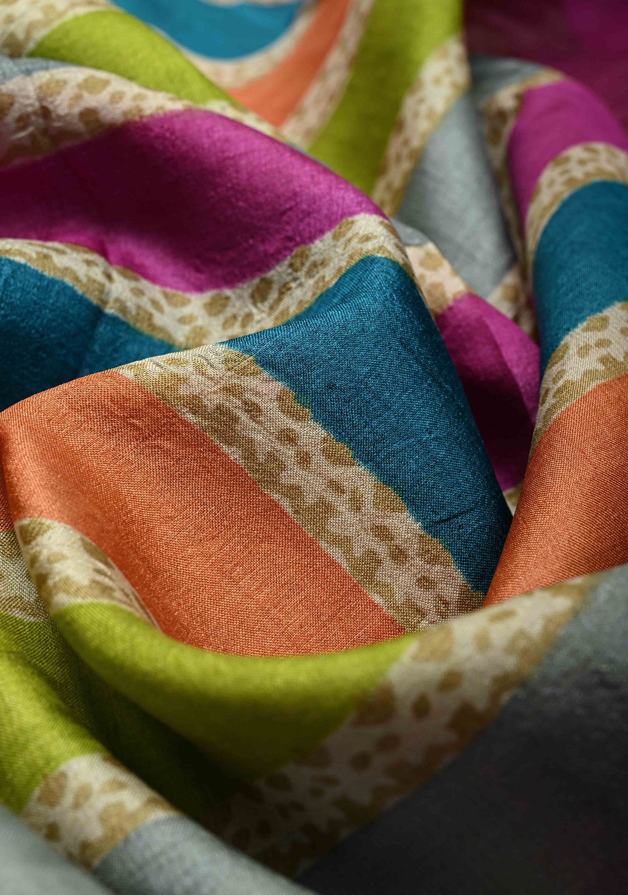 The Multicolor Panel Design Pure Handloom Jari Tussar Silk Saree is a vibrant celebration of traditional artistry and luxurious craftsmanship. Handwoven from premium Tussar silk, this saree features a stunning multicolor panel pattern that adds depth and charm to its elegant drape. The body is beautifully adorned with intricate block prints, showcasing detailed motifs and fine artistry. A rich zari border enhances the overall appeal, lending a regal touch of shimmer and sophistication. Soft, lightweight, and naturally textured, this saree is perfect for festive occasions, weddings, and cultural events—an exquisite blend of heritage and contemporary grace.