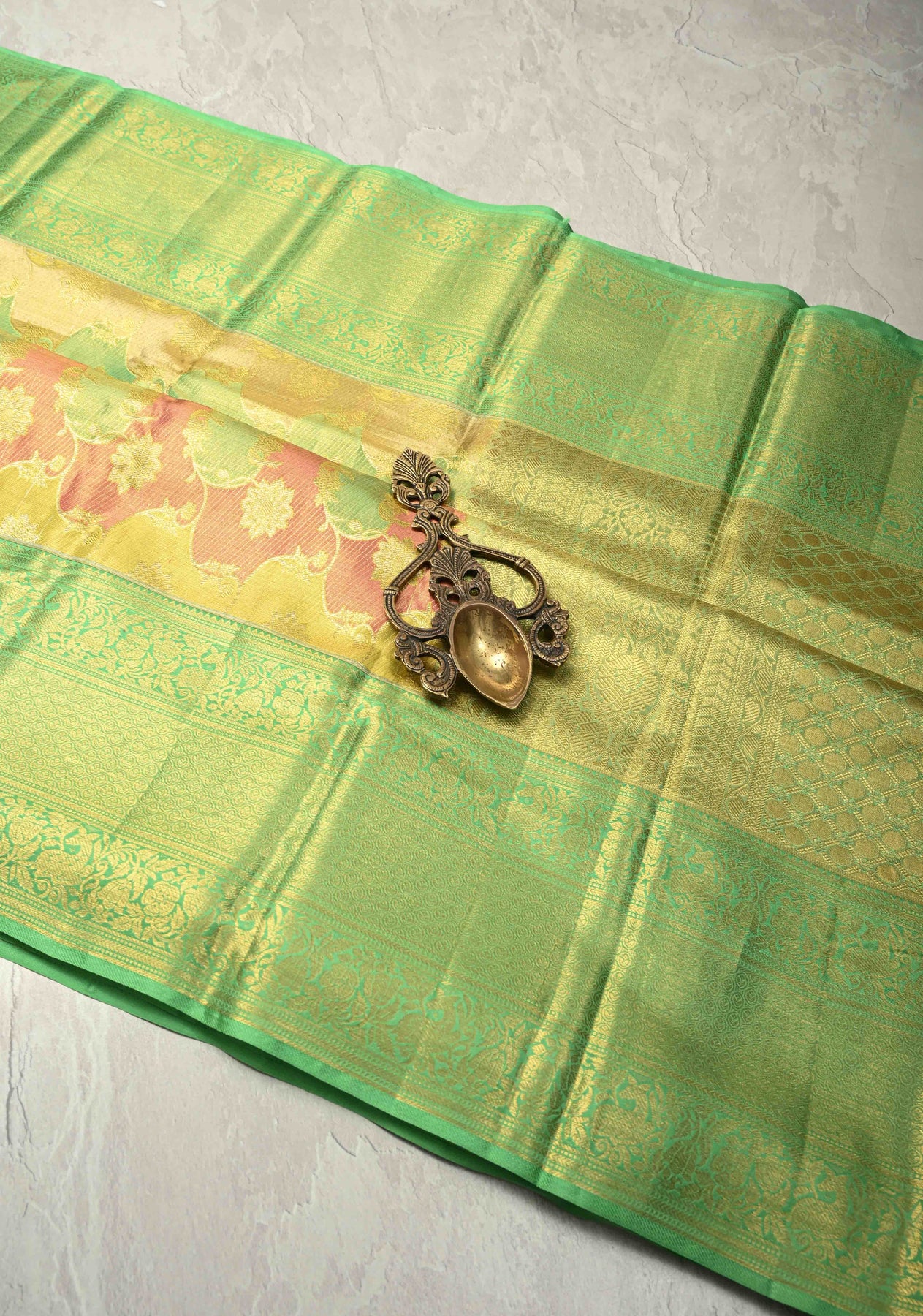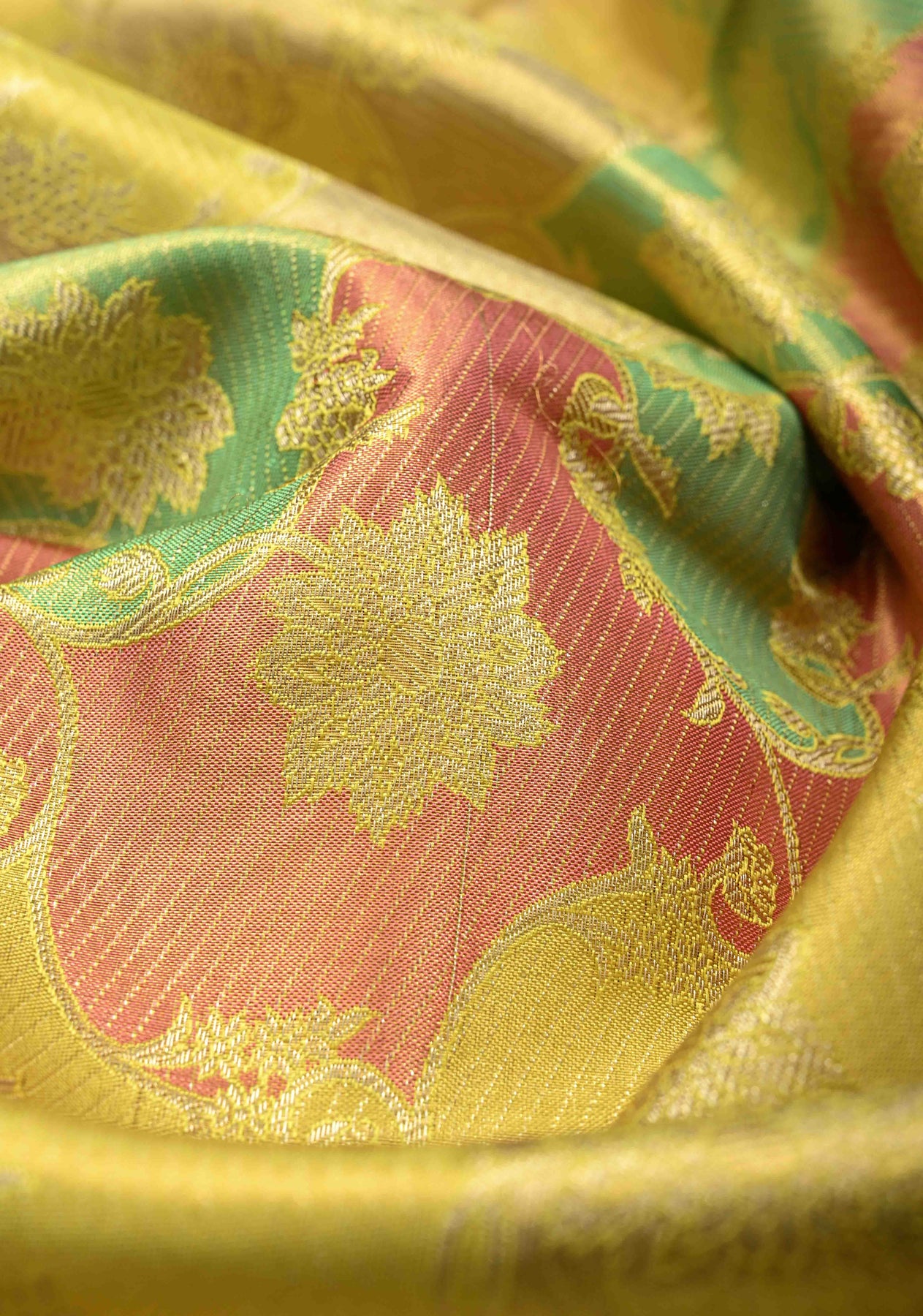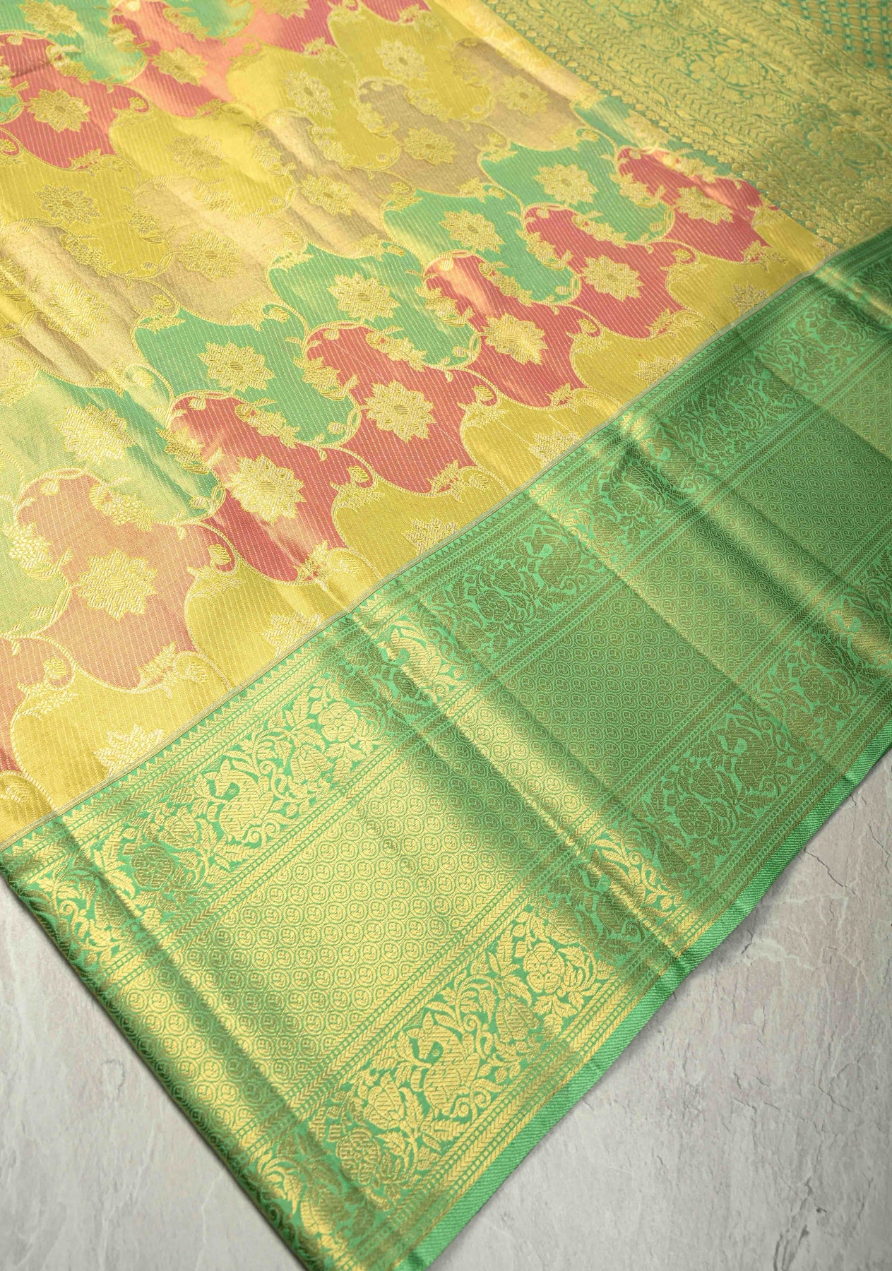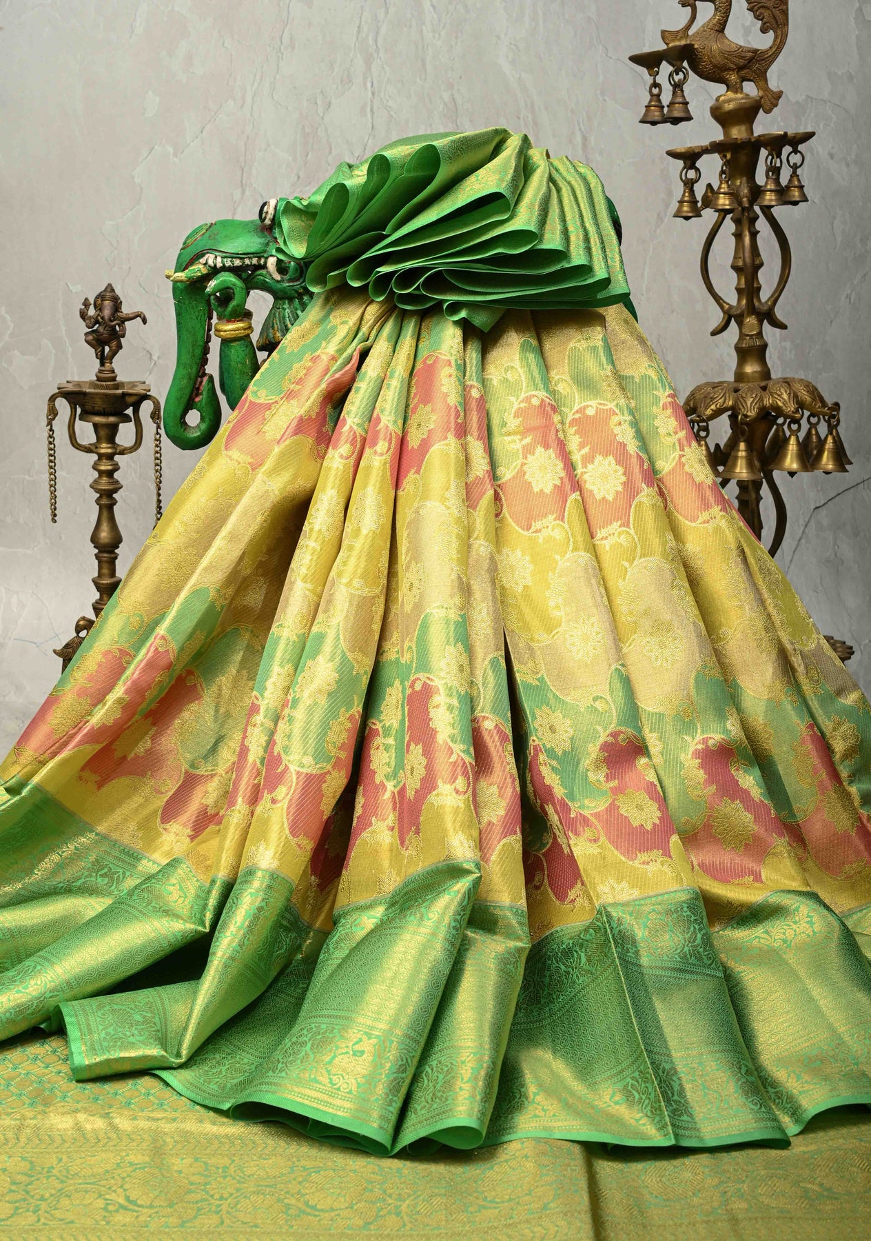 Elevate your ethnic wardrobe with this Multicolor Rangkaat Style Pure Kanjivaram Tissue Silk Saree, a vibrant celebration of South Indian craftsmanship. Woven from Kanjivaram tissue silk, the saree features a striking Rangkaat-style multicolor pattern complemented by an intricate Meenakari floral brocade jaal, adding texture and elegance. The timeless zari border enhances the saree’s regal appeal, making it perfect for weddings, festive occasions, and special celebrations. Lightweight yet in design, this saree drapes gracefully, combining heritage artistry with contemporary vibrance.