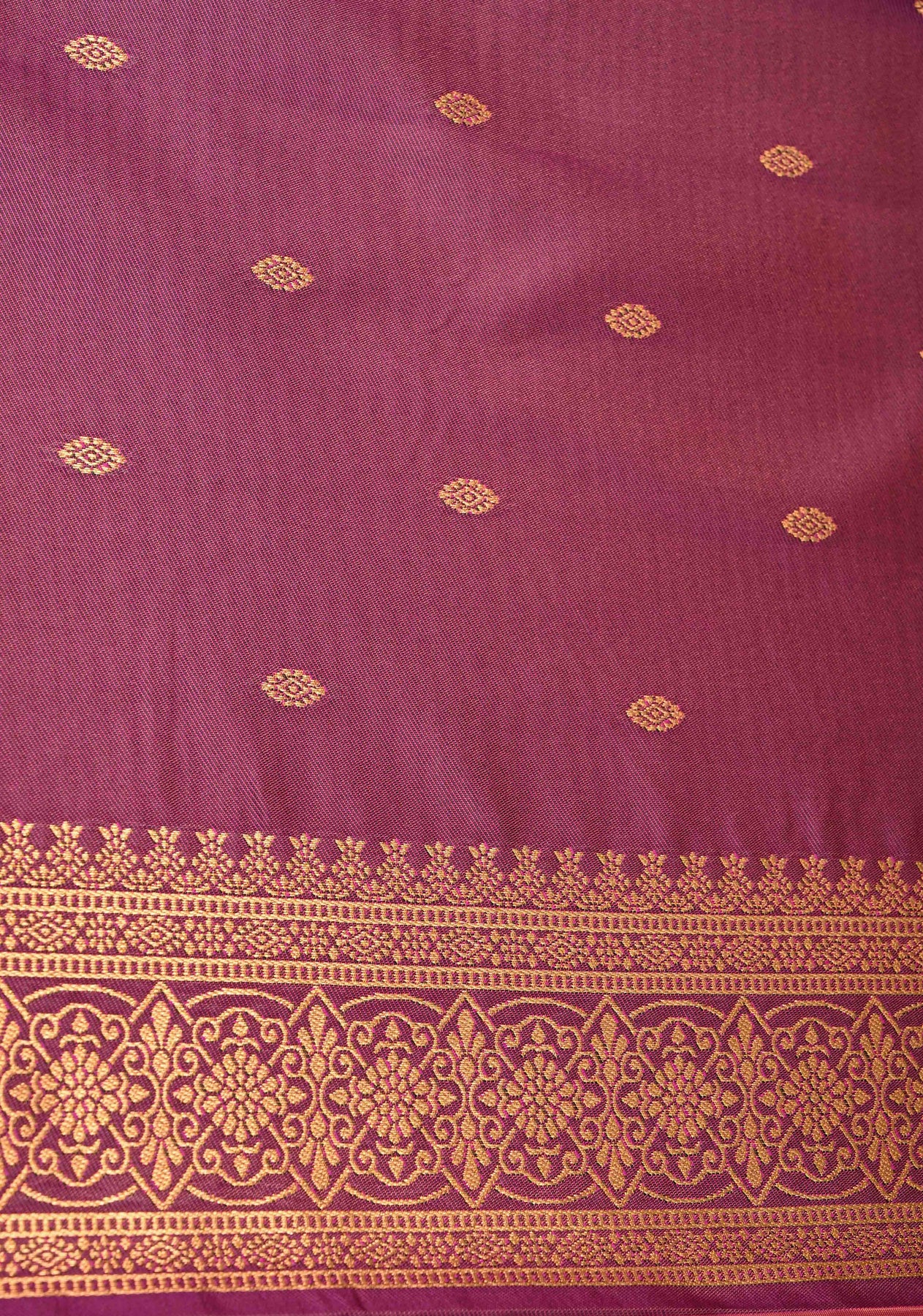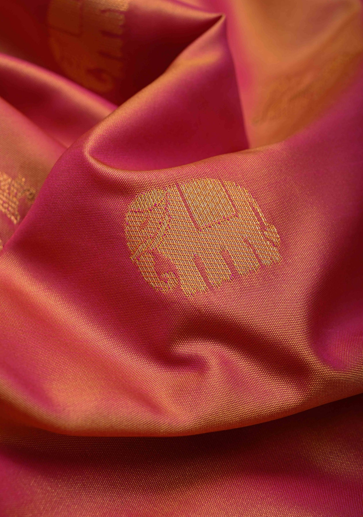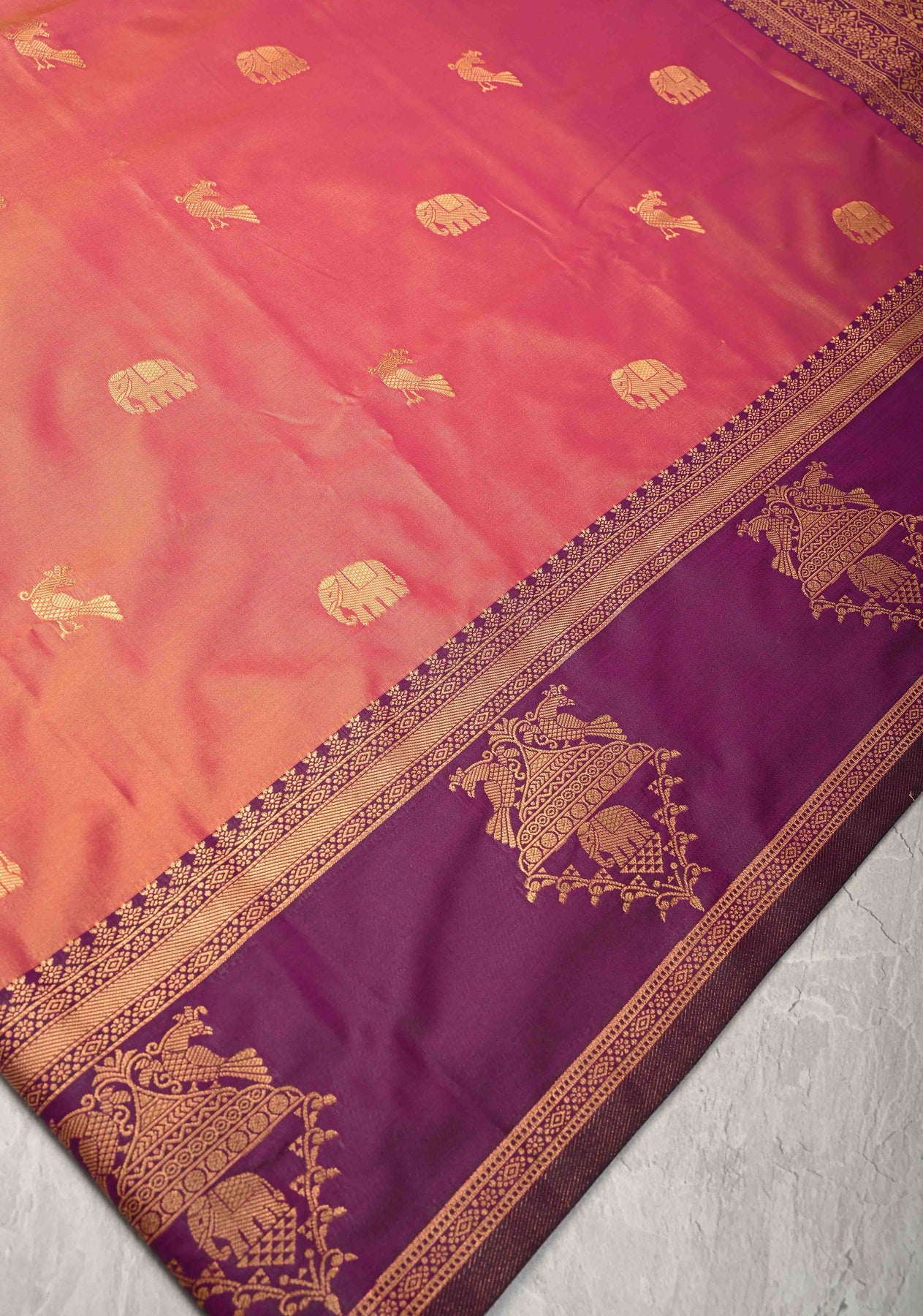 This stunning Mustard Pink Dual Tone Kanchi Semi Silk Saree is a vibrant fusion of color and craftsmanship. The dual-tone effect creates a unique iridescence, with a rich mustard yellow and pink seamlessly blending to offer a dynamic play of light. The saree's body is adorned with elegant elephant-peacock buttas, a classic motif symbolizing grace and power, meticulously woven to add a touch of traditional artistry. A striking contrast zari border frames the saree, providing a bold and beautiful finish that enhances its classic Kanjivaram-inspired appeal. This piece is a perfect choice for those who love bold colors and intricate detailing, ideal for festive celebrations and special occasions.