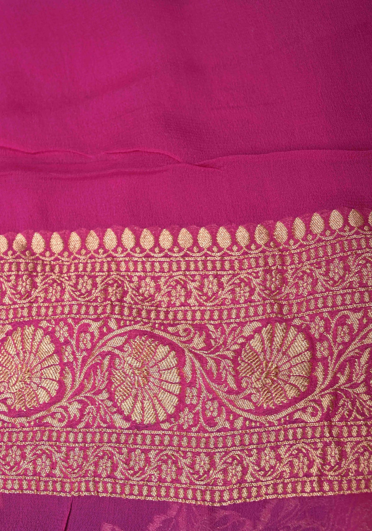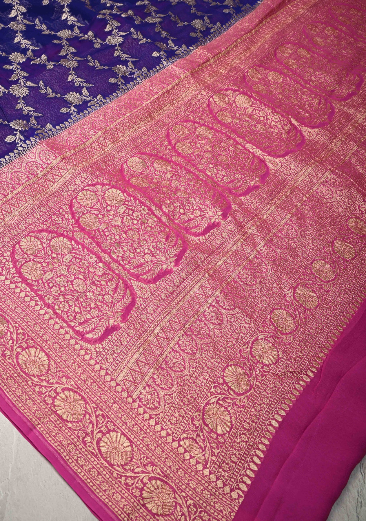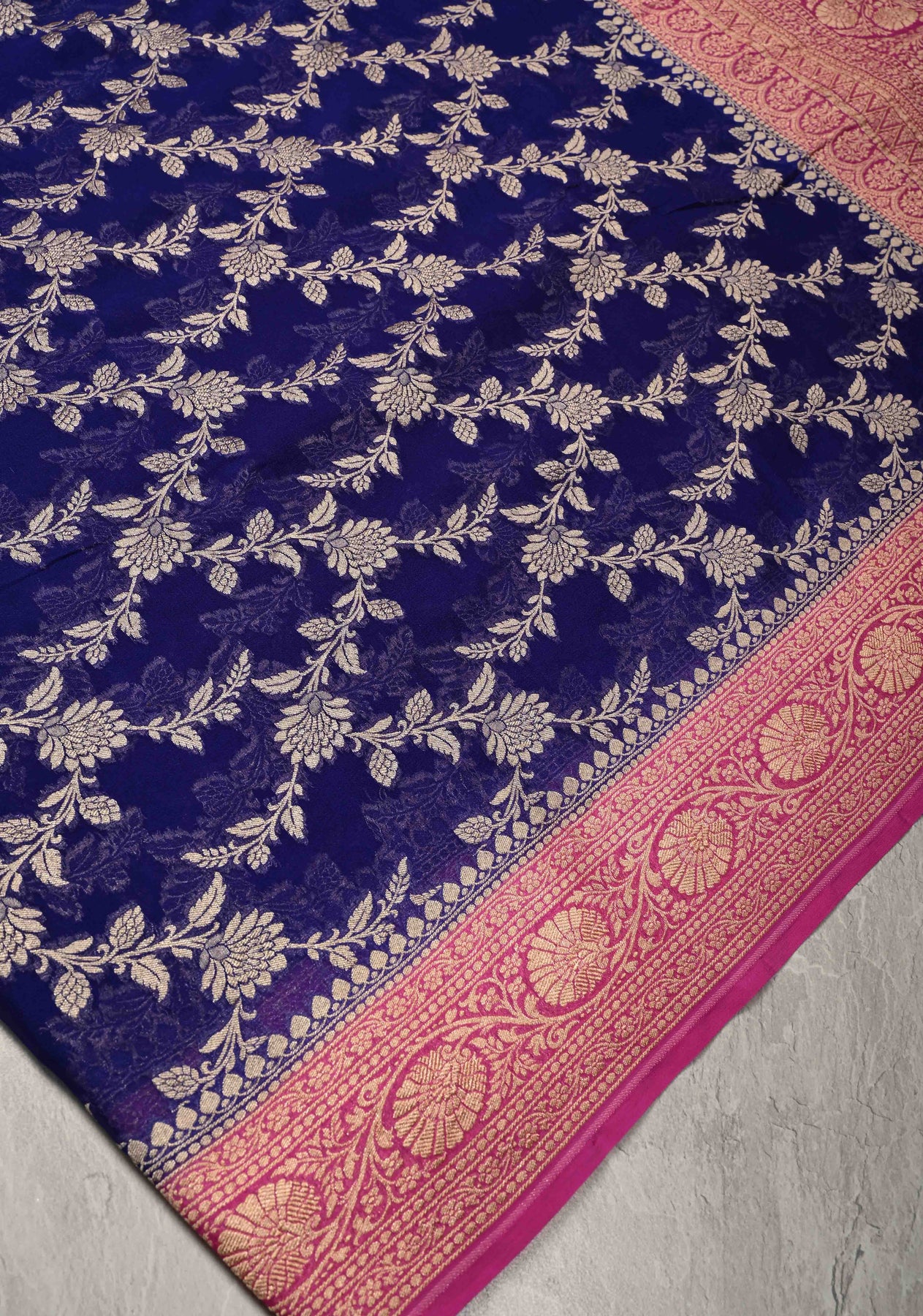Elevate your ethnic wardrobe with this stunning Navy Blue Banarasi Georgette Silk Saree, a timeless blend of tradition and sophistication. Woven with georgette silk, the saree is adorned with an all-over floral jaal that reflects the rich heritage of Banarasi artistry.