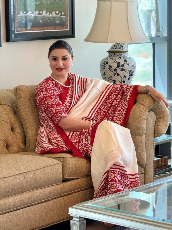 Off White Pure Handloom Tussar Silk Saree with Handblock Print on Border and Pallu | SILK MARK CERTIFIED